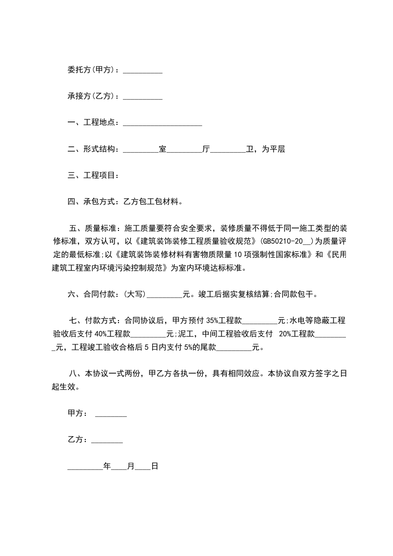五、质量标准:施工质量要符合安全要求,装修质量不得低于同一施工类型的装修标准,双方认可,以《建筑装饰装修工程质量验收规范》(GB50210-20__)为质量评定的最低标准;以《建筑装饰装修材料有害物质限量10项强制性国家标准》和《民用建筑工程室内环境污染控制规范》为室内环境达标标准。