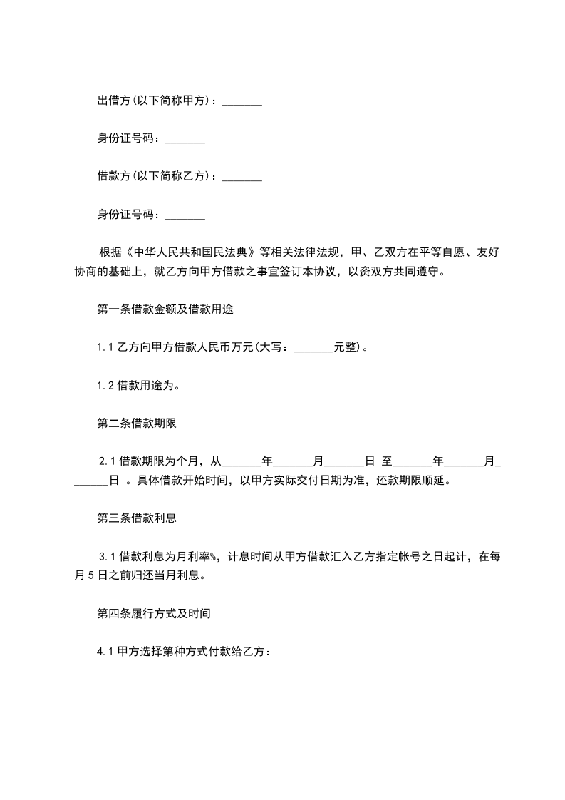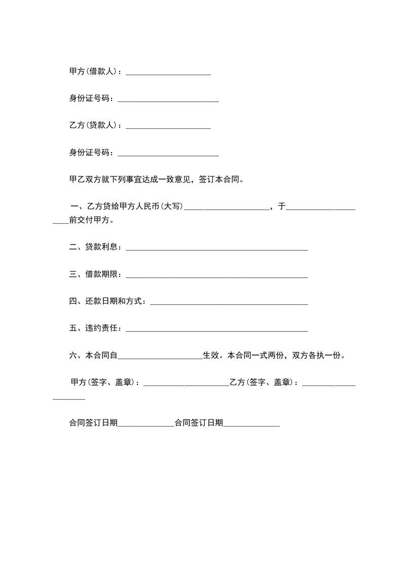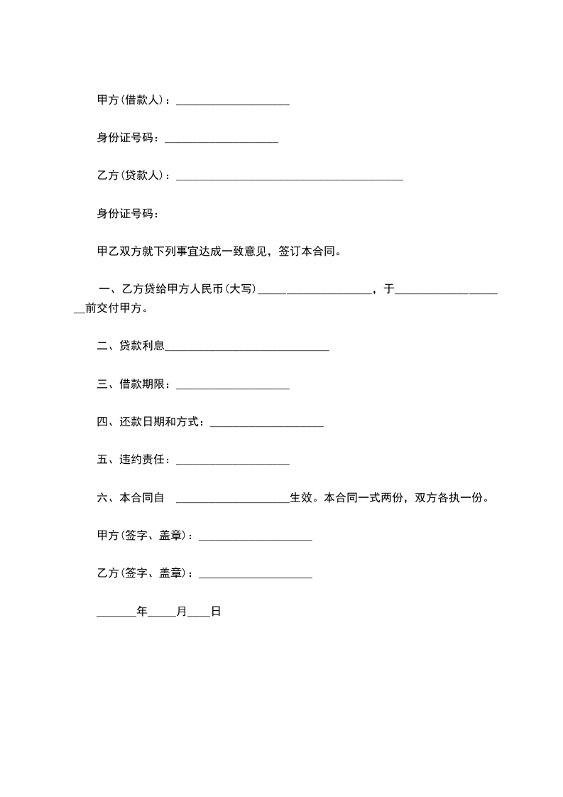 一、乙方贷给甲方人民币(大写)_____________________,于_____________________前交付甲方。