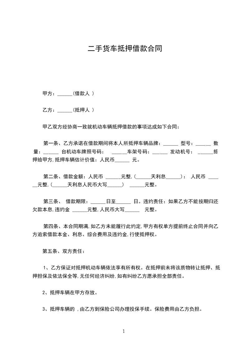 第一条、乙方承诺在借款期间将本人所抵押车辆品牌:______ 型号:______ 数量:______ 台机动车牌照号码: ______车架号码:______ 发动机号: ______抵押给甲方,抵押车辆估计价值:人民币______ 元。