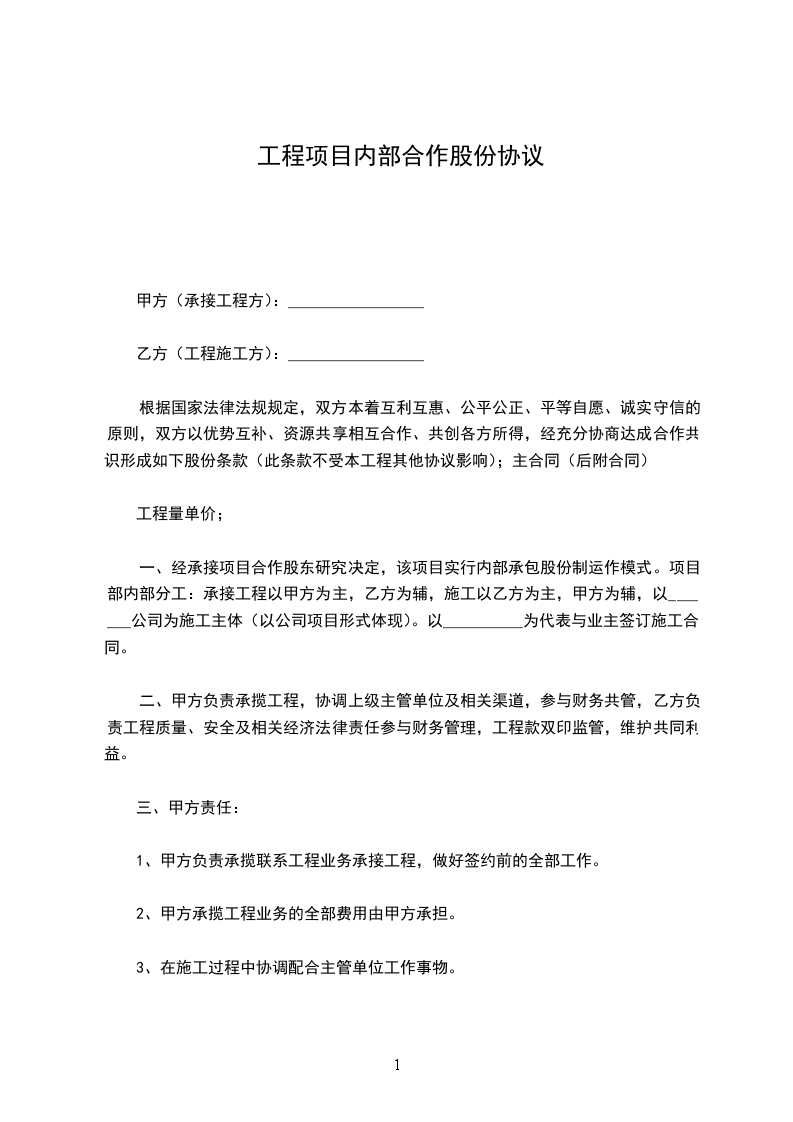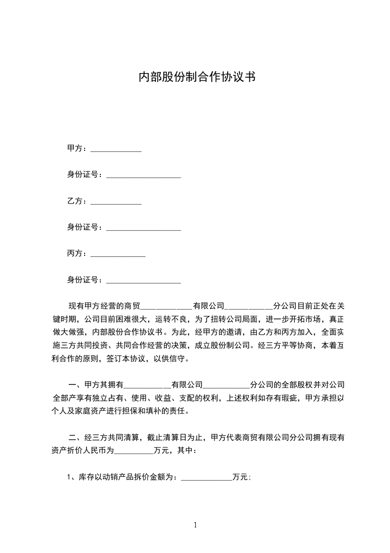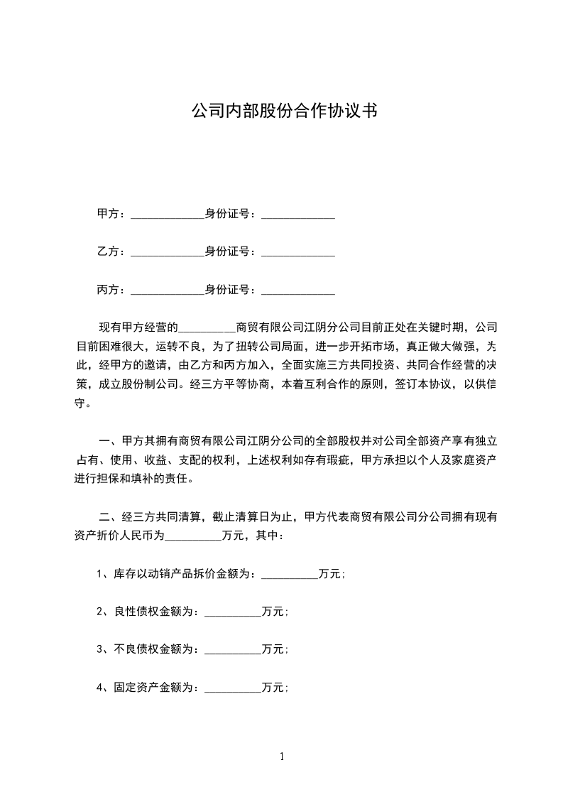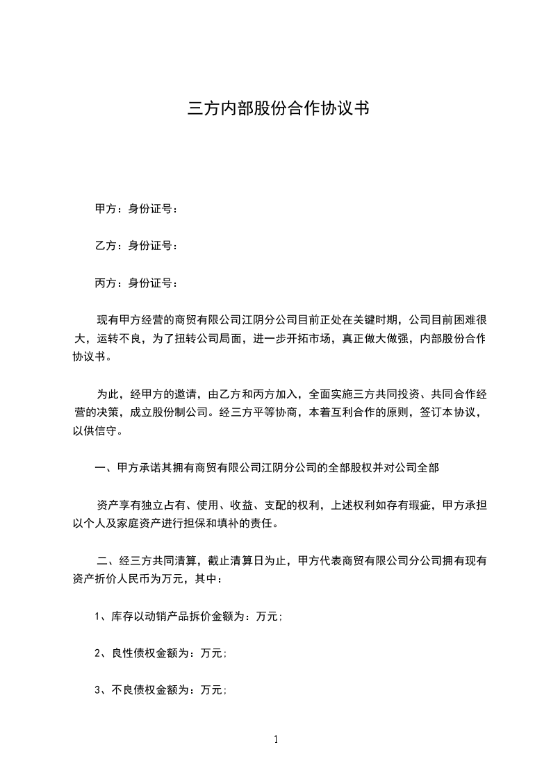 现有甲方经营的商贸_____________有限公司____________分公司目前正处在关键时期,公司目前困难很大,运转不良,为了扭转公司局面,进一步开拓市场,真正做大做强,内部股份合作协议书。为此,经甲方的邀请,由乙方和丙方加入,全面实施三方共同投资、共同合作经营的决策,成立股份制公司。经三方平等协商,本着互利合作的原则,签订本协议,以供信守。