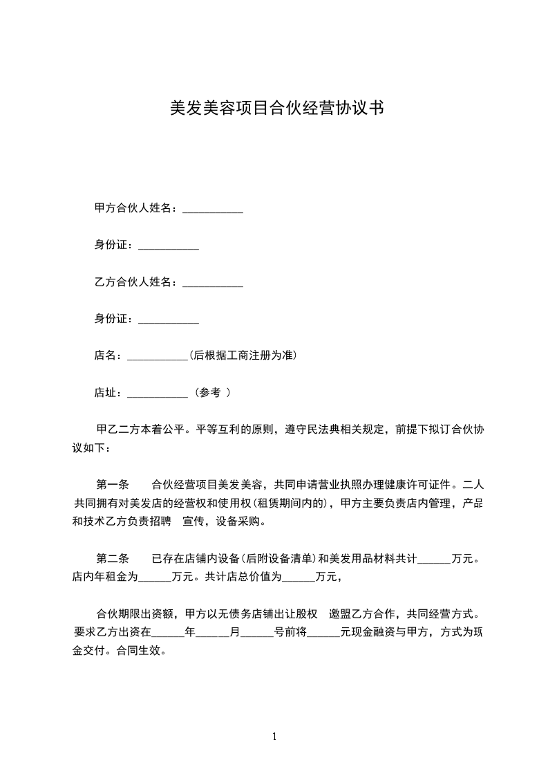 第一条 合伙经营项目美发美容,共同申请营业执照办理健康许可证件。二人共同拥有对美发店的经营权和使用权(租赁期间内的),甲方主要负责店内管理,产品和技术乙方负责招聘 宣传,设备采购。