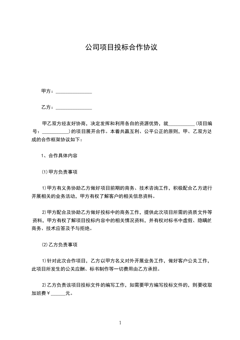甲乙双方经友好协商,决定发挥和利用各自的资源优势,就___________(项目编号:___________)的项目展开合作。本着共赢互利、公平公正的原则,甲、乙双方达成的合作框架协议如下: