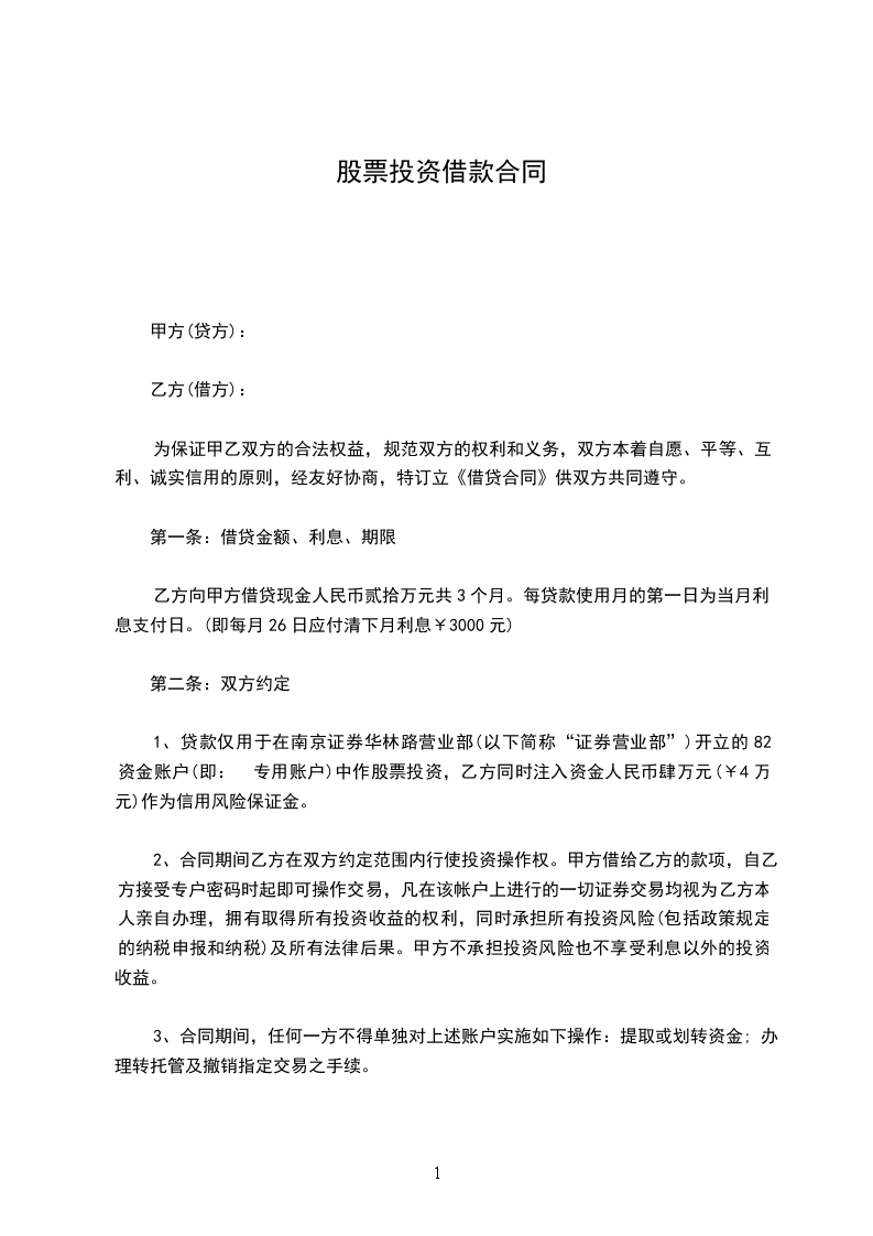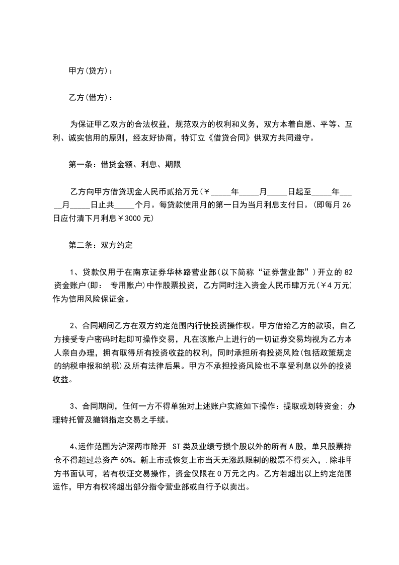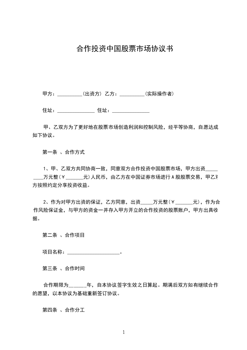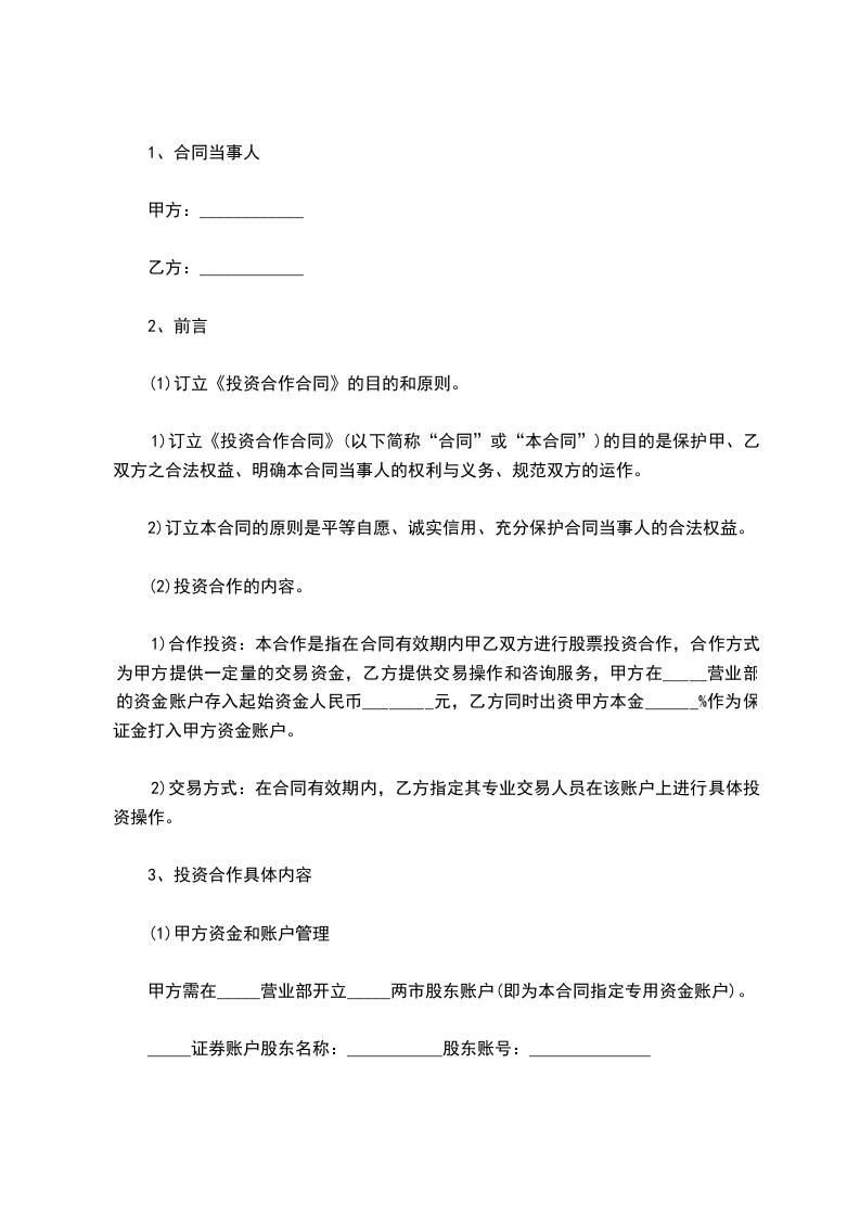 1)合作投资:本合作是指在合同有效期内甲乙双方进行股票投资合作,合作方式为甲方提供一定量的交易资金,乙方提供交易操作和咨询服务,甲方在_____营业部的资金账户存入起始资金人民币________元,乙方同时出资甲方本金______%作为保证金打入甲方资金账户。
