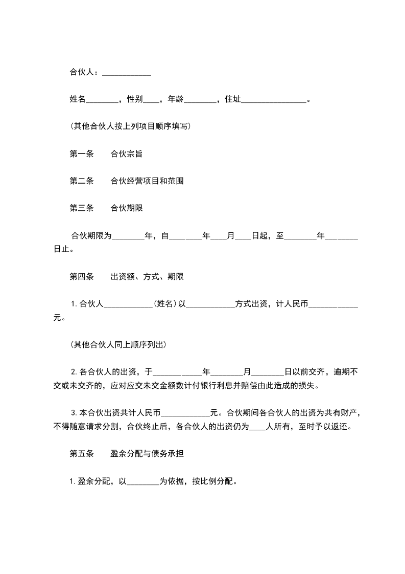 1.合伙人____________(姓名)以____________方式出资,计人民币____________元。