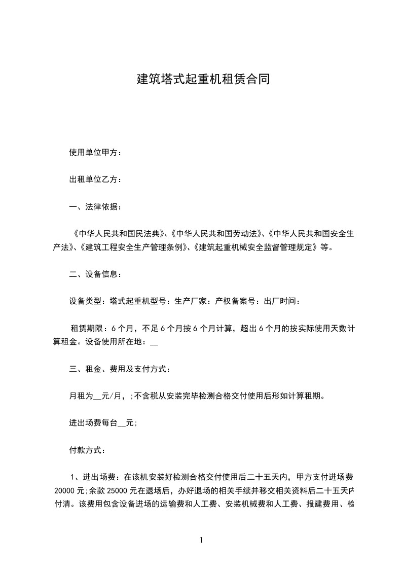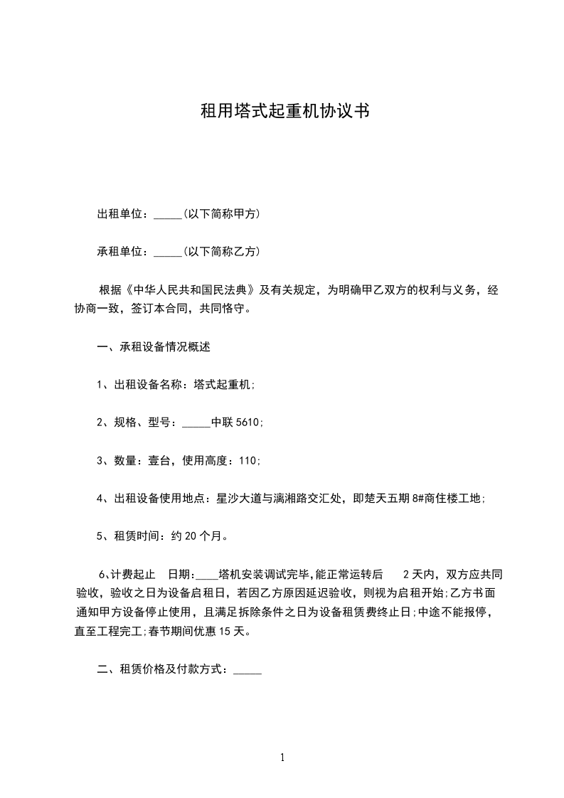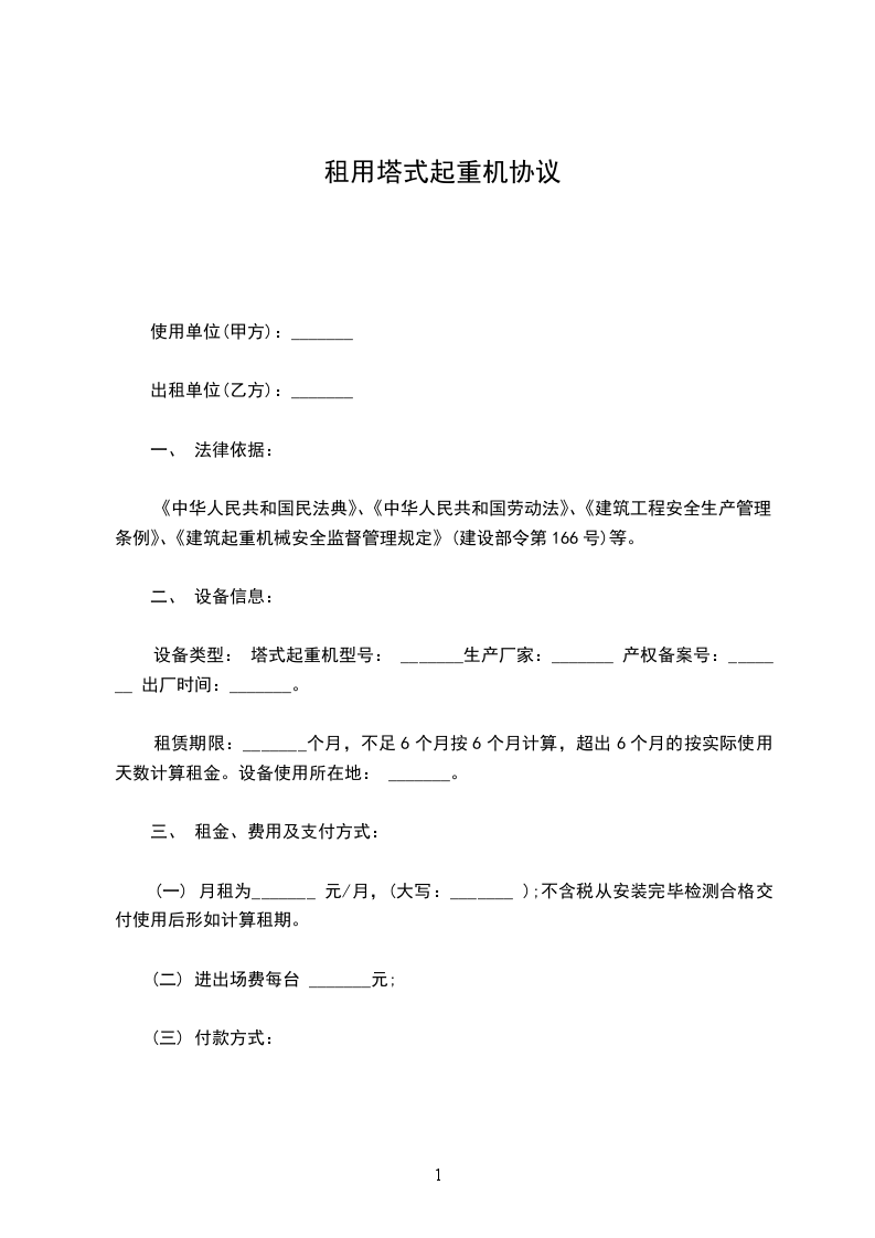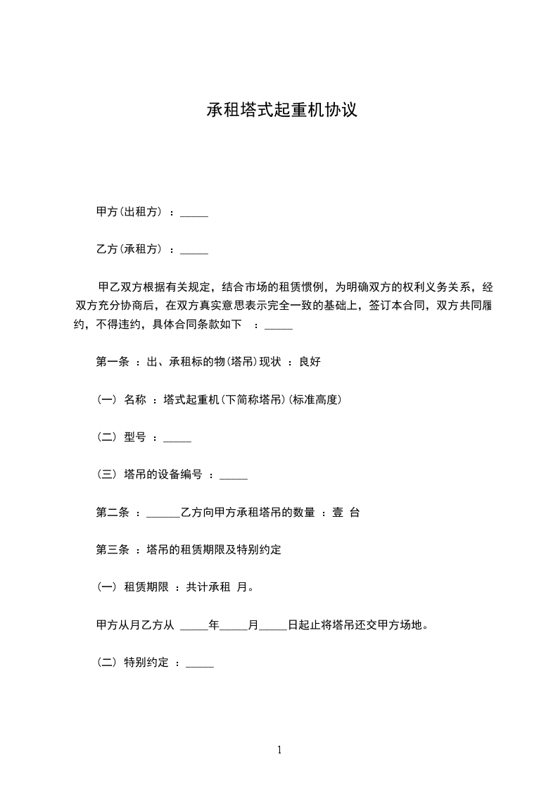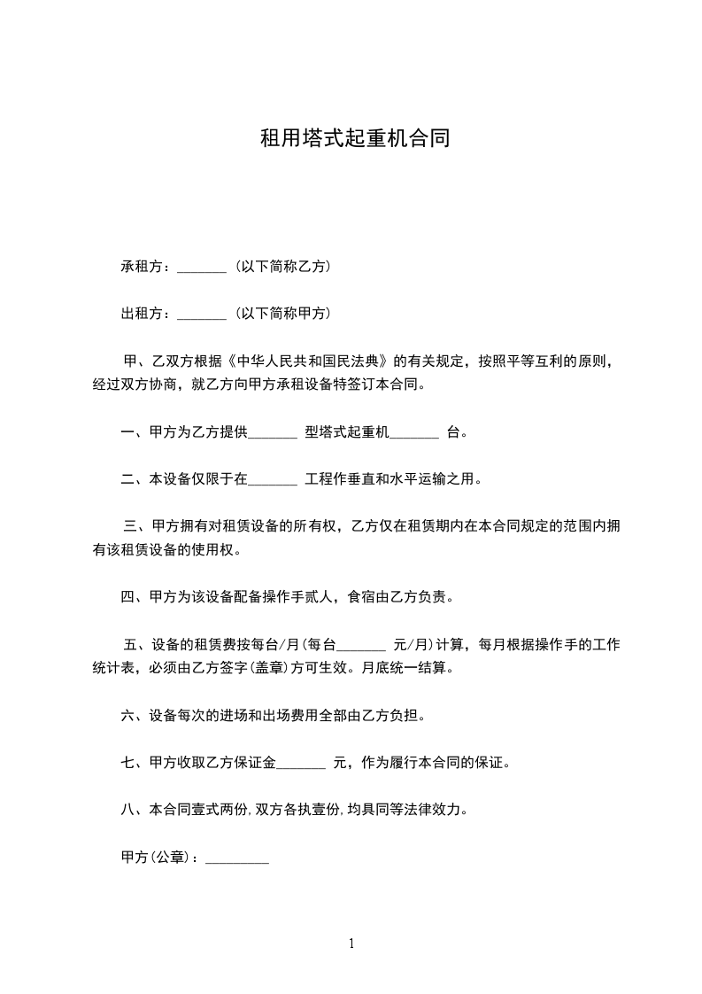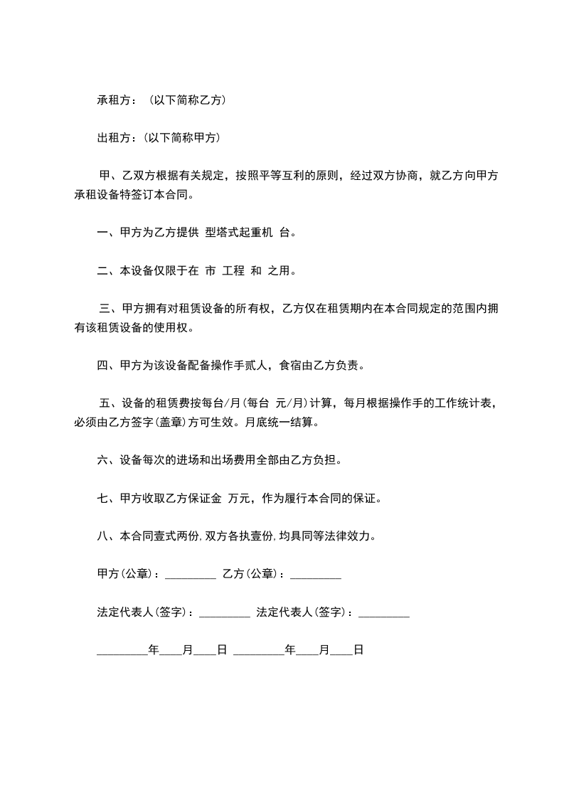 一、甲方为乙方提供_______ 型塔式起重机_______ 台。