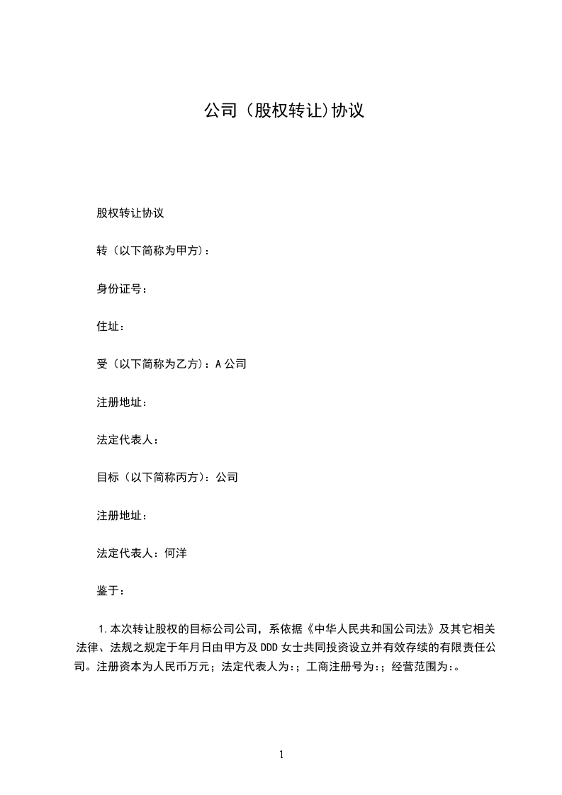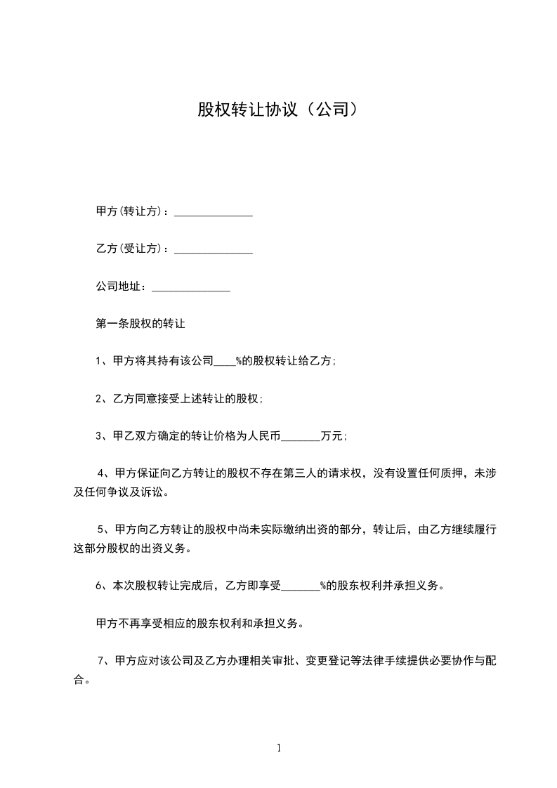 甲方将其拥有的公司_____%股权转让给乙方。
