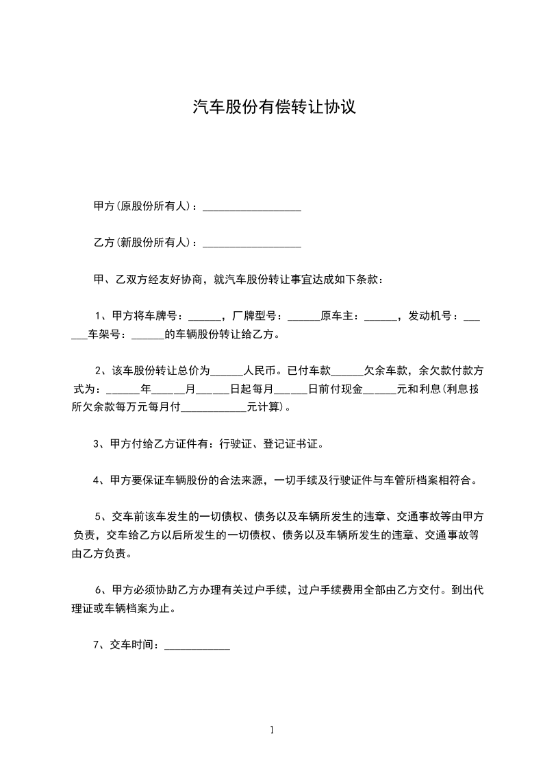 1、甲方将车牌号:______,厂牌型号:______原车主:______,发动机号:______车架号:______的车辆股份转让给乙方。