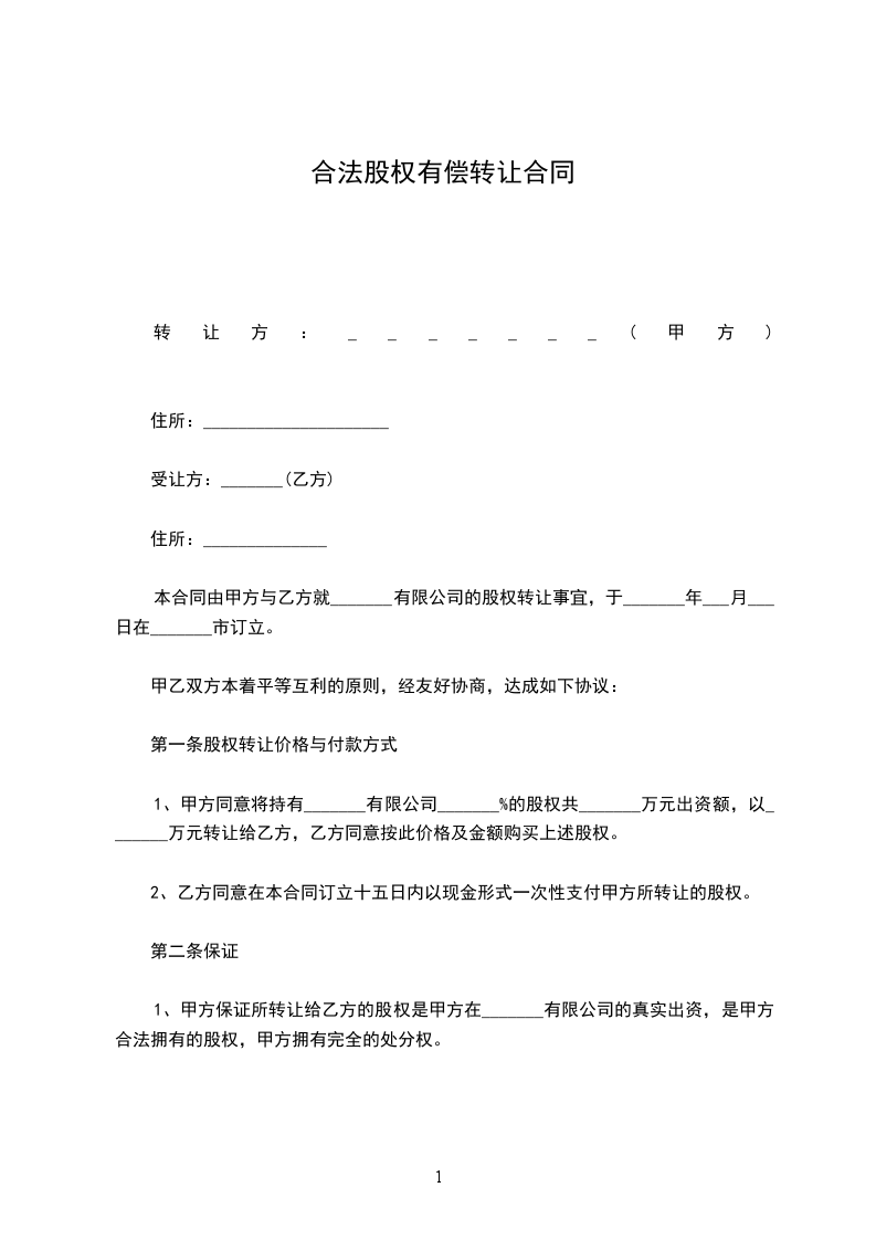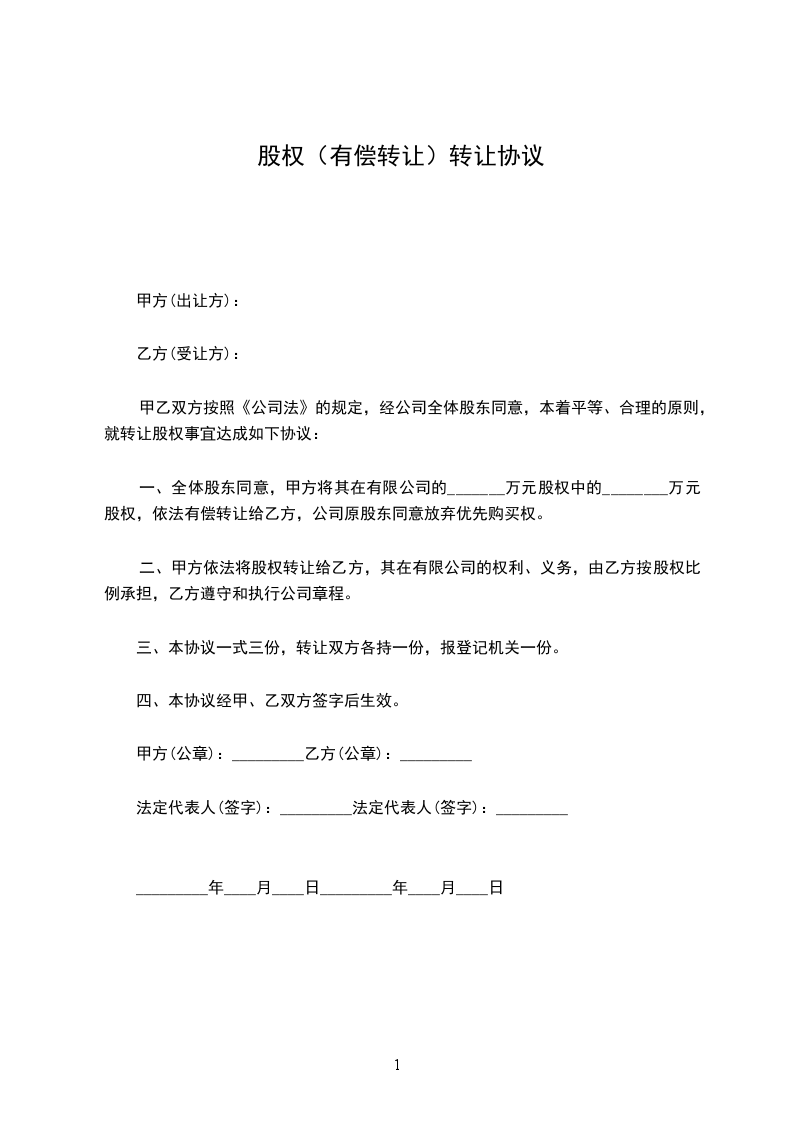 1、甲方同意将持有_______有限公司_______%的股权共_______万元出资额,以_______万元转让给乙方,乙方同意按此价格及金额购买上述股权。