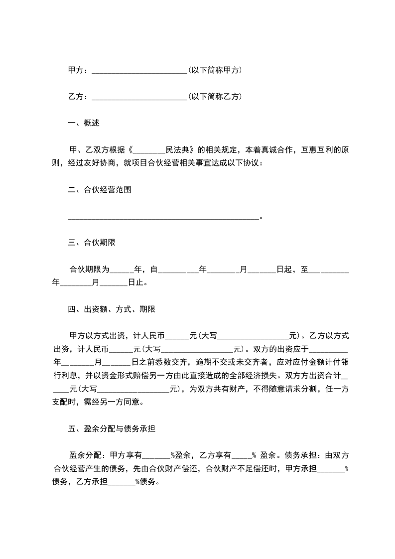甲、乙双方根据《________民法典》的相关规定,本着真诚合作,互惠互利的原则,经过友好协商,就项目合伙经营相关事宜达成以下协议: