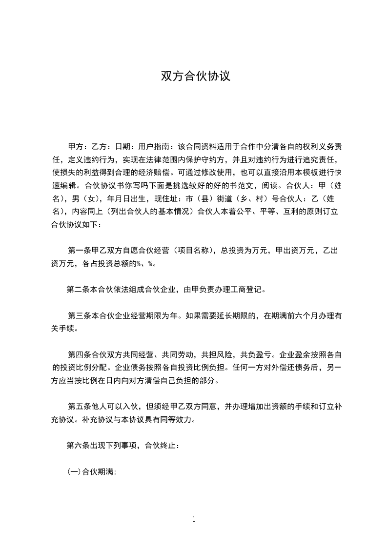 十、纠纷的解决甲乙双方如发生纠纷,应共同协商,本着有利于合伙事业发展的原则予以解决。如协商不成,可以诉诸法院。