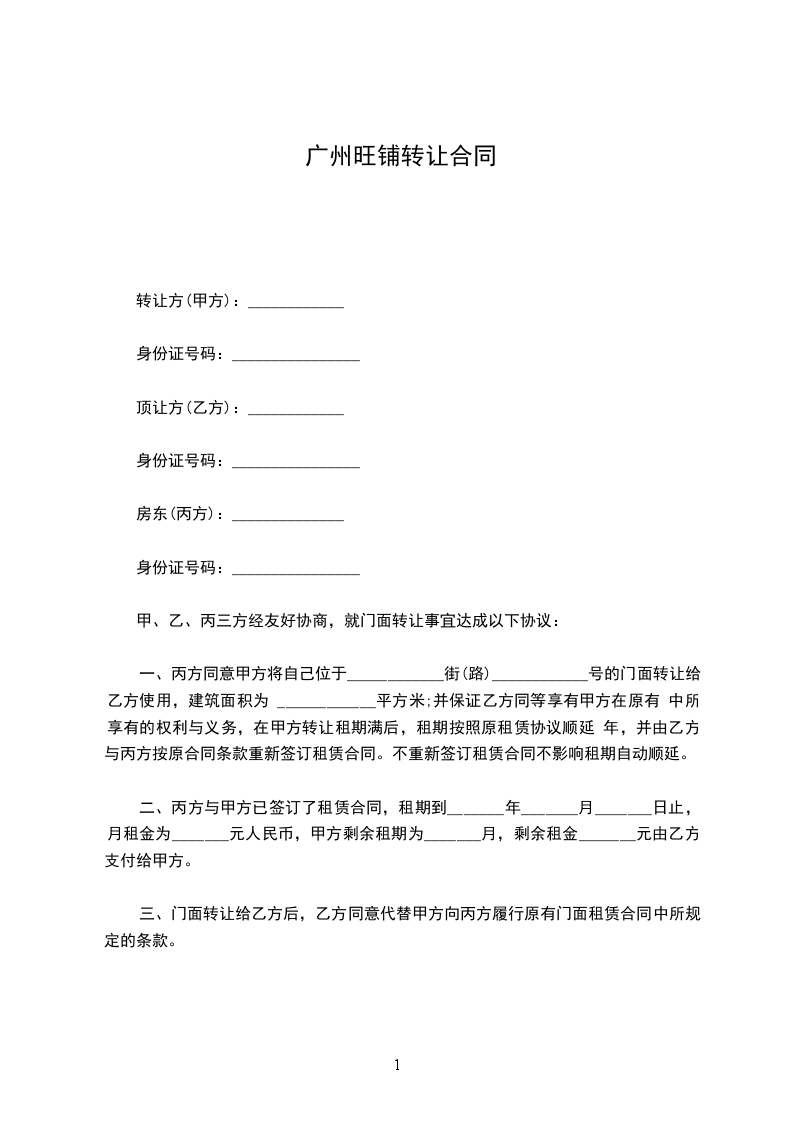 一、丙方同意甲方将自己位于____________街(路)____________号的门面转让给乙方使用,建筑面积为 ____________平方米;并保证乙方同等享有甲方在原有 中所享有的权利与义务,在甲方转让租期满后,租期按照原租赁协议顺延 年,并由乙方与丙方按原合同条款重新签订租赁合同。不重新签订租赁合同不影响租期自动顺延。