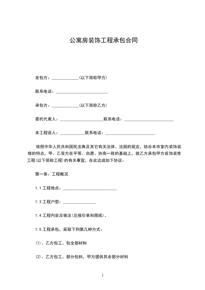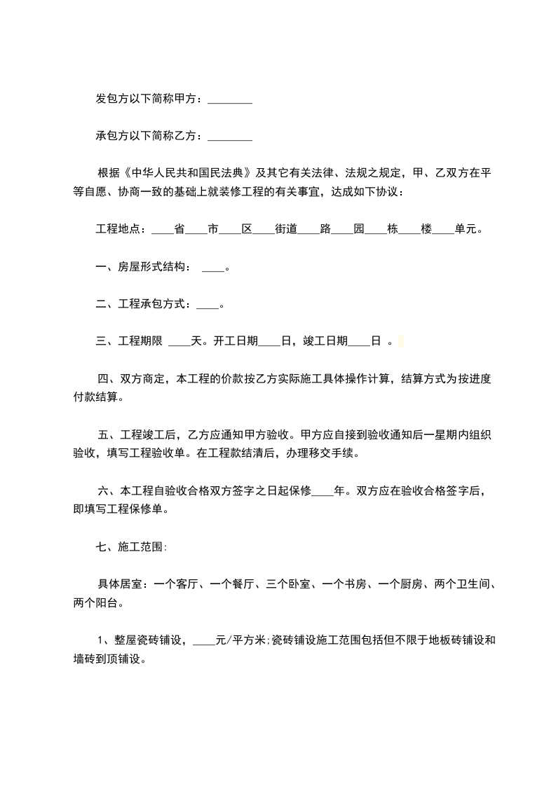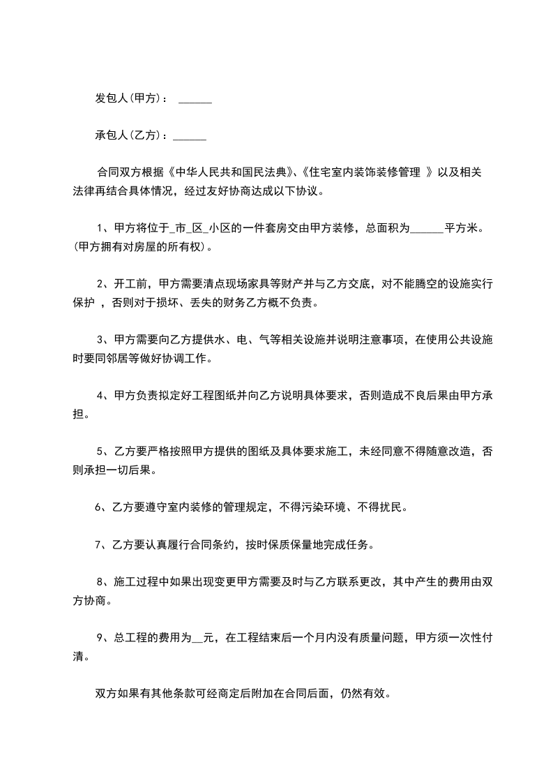 1、甲方将位于_市_区_小区的一件套房交由甲方装修,总面积为______平方米。(甲方拥有对房屋的所有权)。