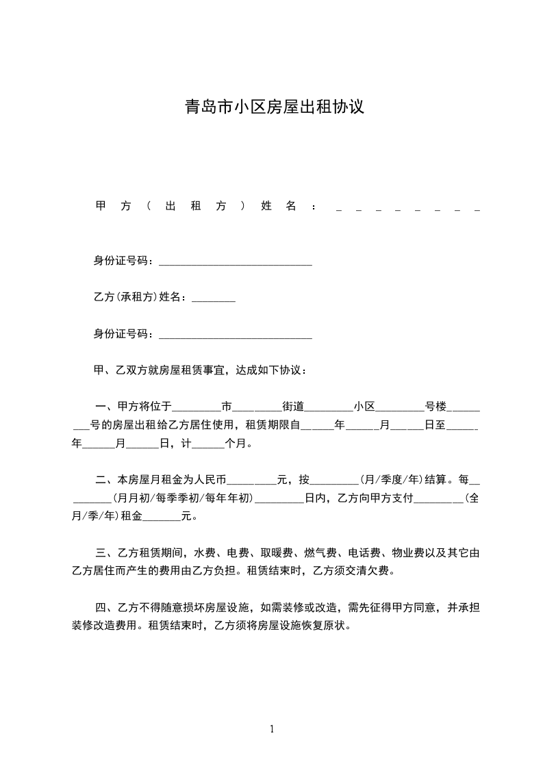 一、甲方将位于_________市_________街道_________小区_________号楼_________号的房屋出租给乙方居住使用,租赁期限自______年______月______日至______年______月______日,计______个月。