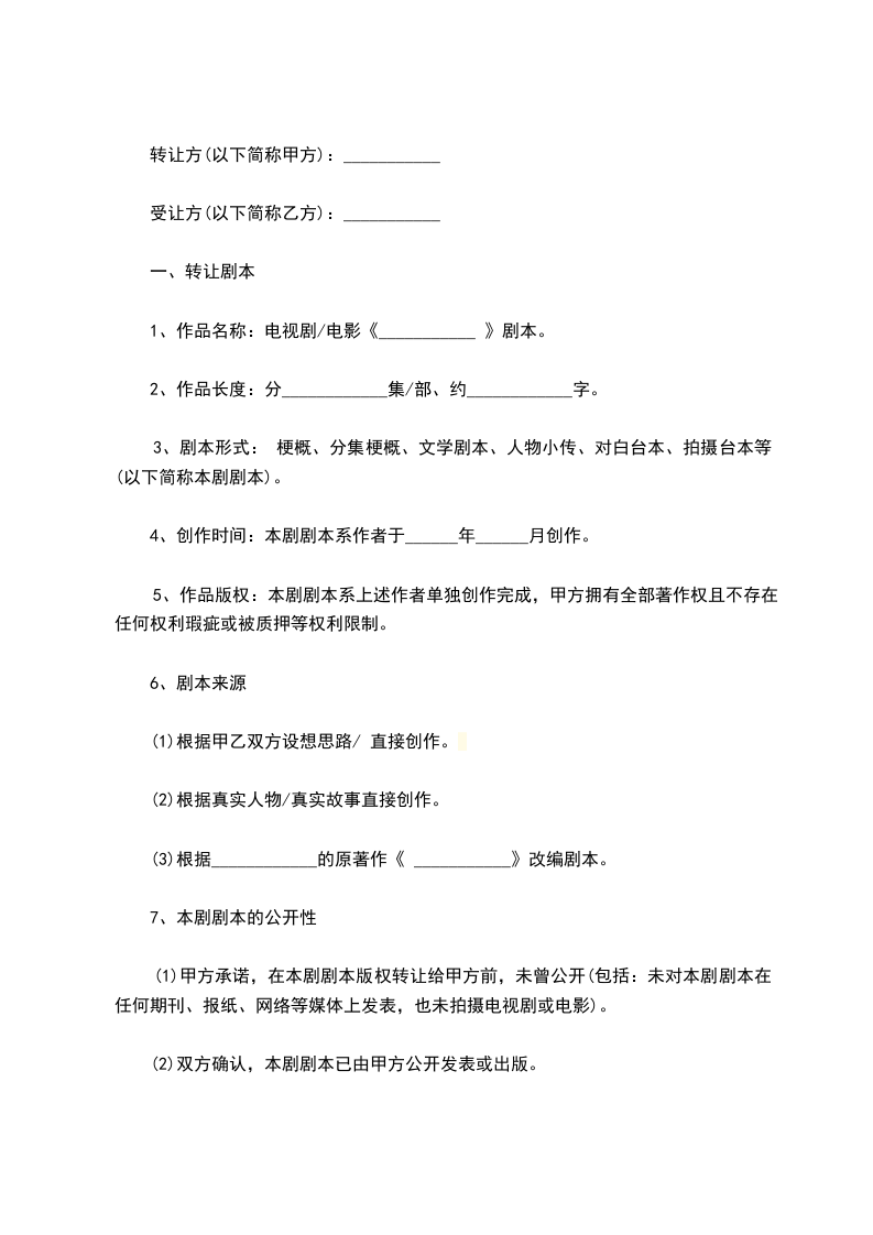 (1)甲方承诺,在本剧剧本版权转让给甲方前,未曾公开(包括:未对本剧剧本在任何期刊、报纸、网络等媒体上发表,也未拍摄电视剧或电影)。