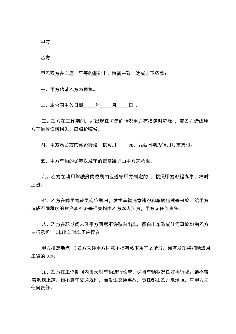 一、甲方聘请乙方为司机。
