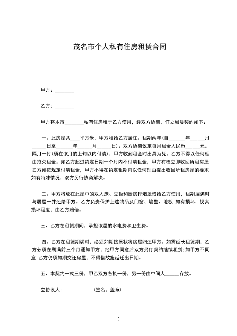 甲方将本市________私有住房租于乙方使用,经双方协商,仃立租赁契约如下: