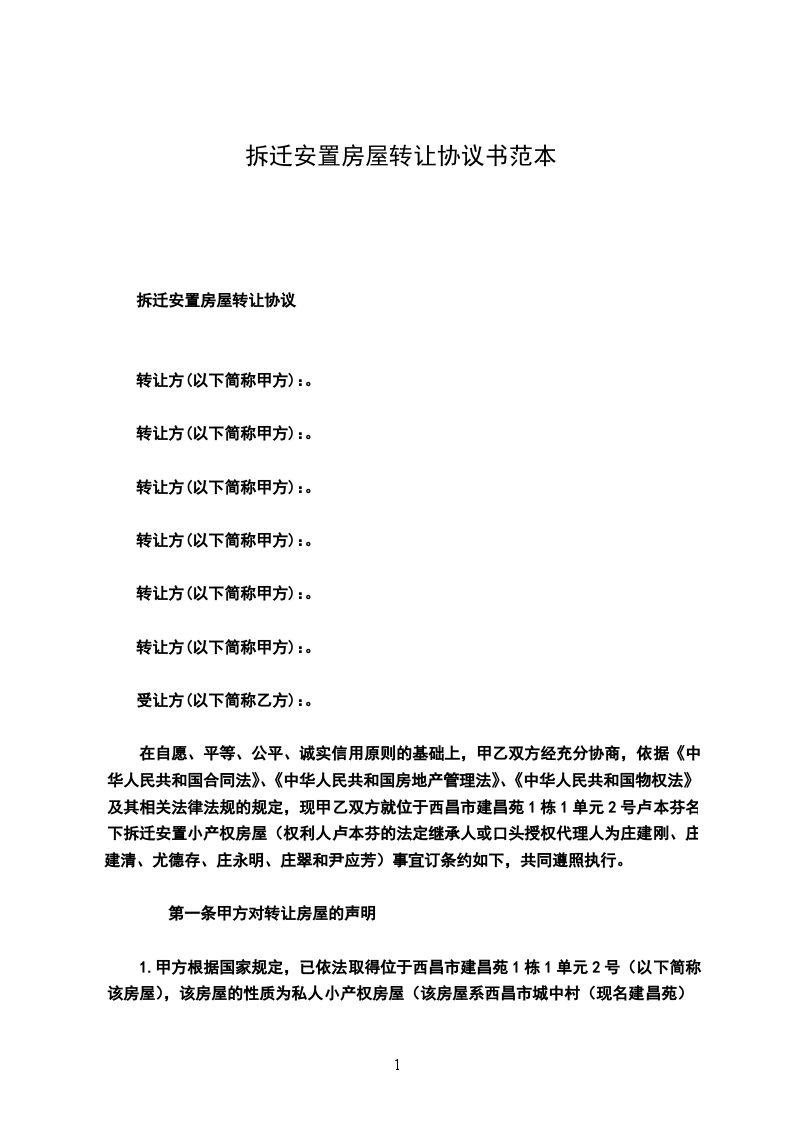 2.在本协议签订前,甲方保证转让房屋原权利人为卢本芬,并且保证原权利人卢本芬的法定继承人或口头授权代理人就是本协议列明的甲方,现原权利人卢本芬的所有法定继承人均同意将位于西昌市建昌苑1栋1单元2号拆迁安置小产权房屋转让给乙方。