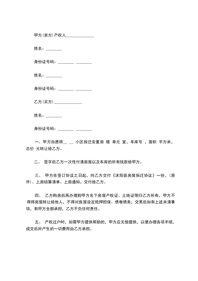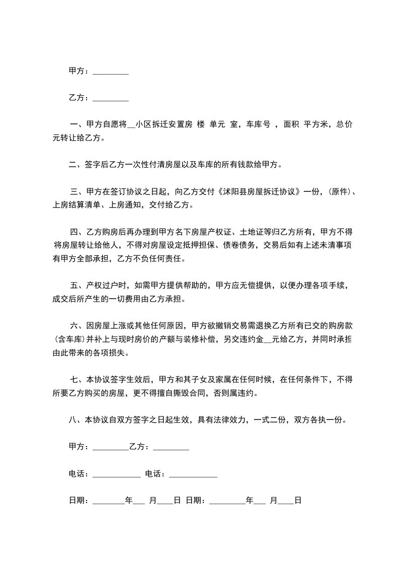 3.本协议生效后,若遇政府拆迁该房屋,该房屋的拆迁安置补偿费及安置房由乙方享受,并由乙方直接与拆迁相关单位签订安置补偿协议及办理手续,与甲方完全无关。