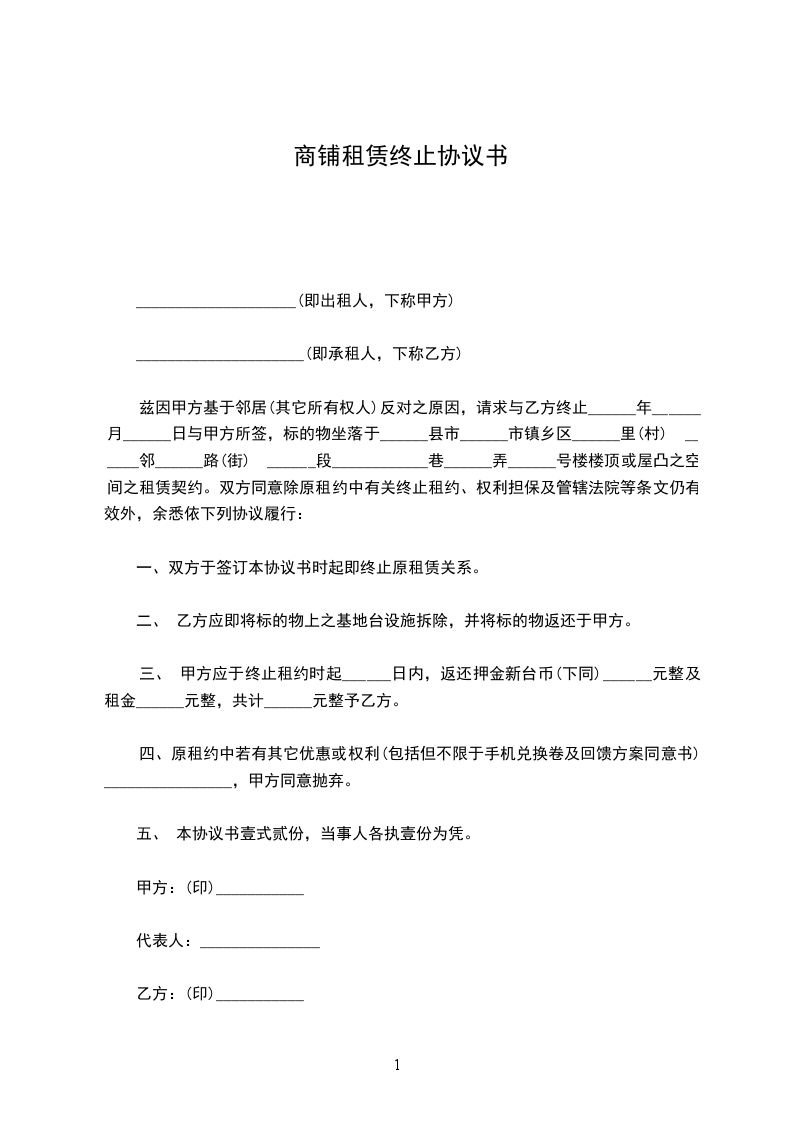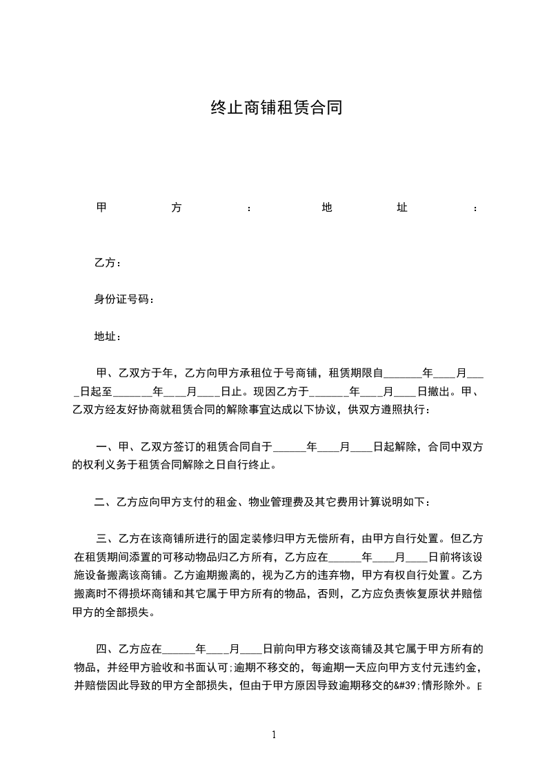 一、乙方于_________年_________月_________日前将铺位退回给甲方使用,如乙方不按时退租,每逾期一天,需向甲方支付_________元(_________)违约金,逾期达七天,甲方有权无偿收回铺位,由此产生的一切损失和责任由乙方负责。