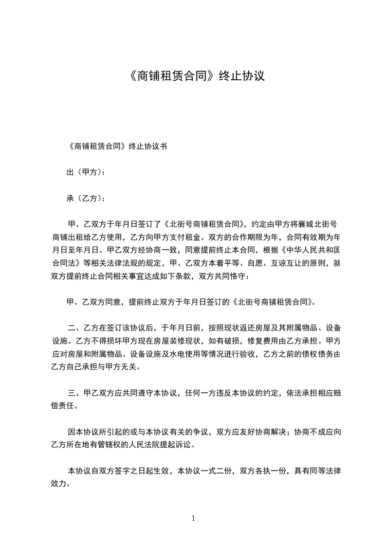 经协商,双方愿意解除位于_________(铺位)的租赁合同,并达成一致意见,为明确责任,保障双方合法权益,特签定本协议,条款如下: