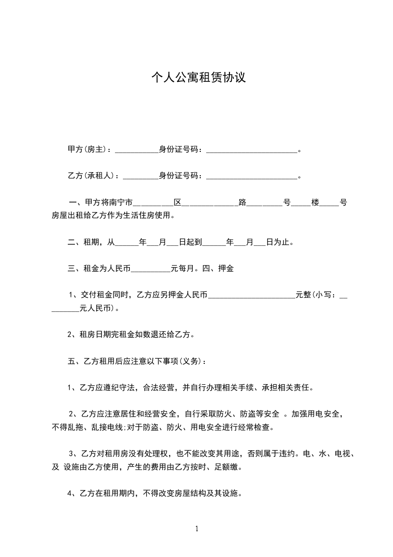 一、甲方将南宁市__________区______________路_________号_____楼_____号房屋出租给乙方作为生活住房使用。