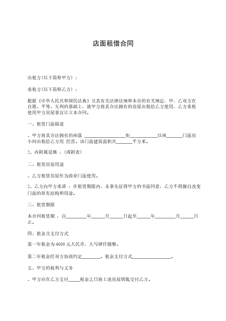 4、租赁期限:从____月____日止。租赁期内每月租金为人民币_____元 。不变。
