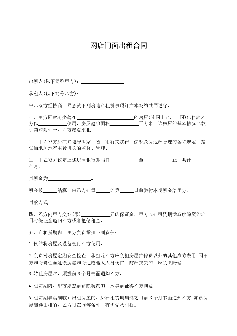 5、乙方在合同执行期间内,未经甲方同意而将商铺转租或变相抵押他人(单位),甲方无条件收回商铺和保证金,其余概同甲方无涉。