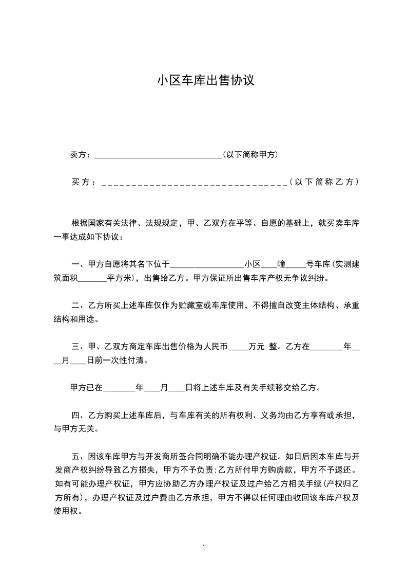 一、甲方自愿将其名下位于__________________小区____幢_____号车库(实测建筑面积_______平方米),出售给乙方。甲方保证所出售车库产权无争议纠纷。