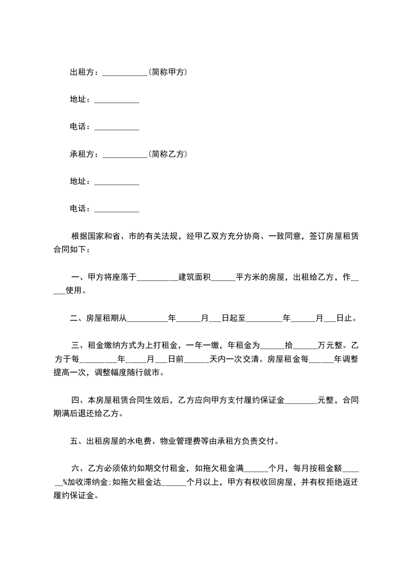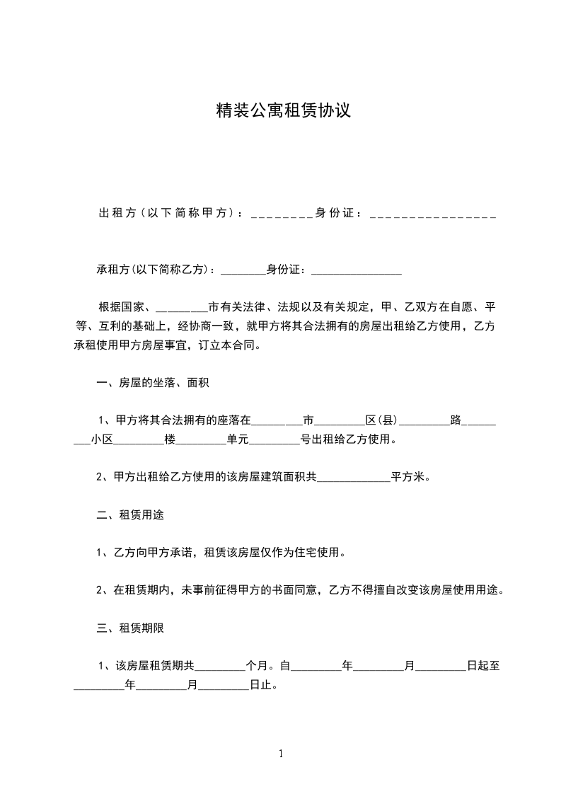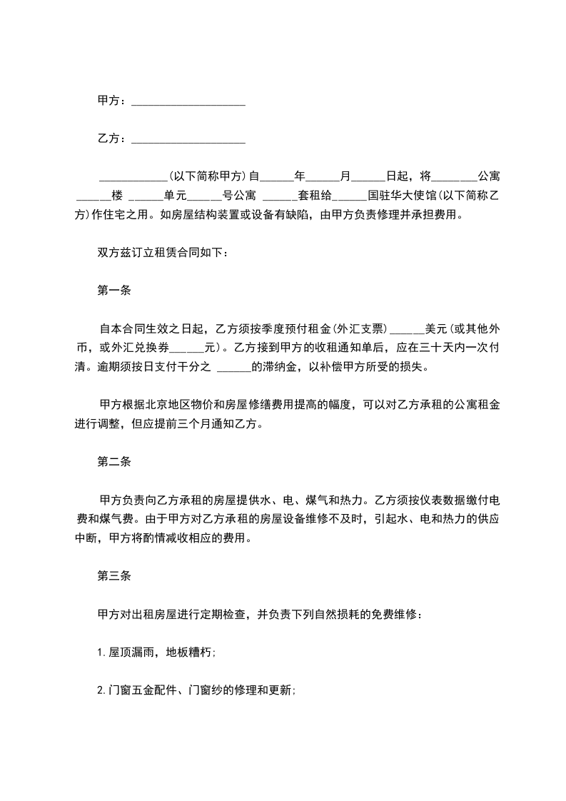 1、甲方将其合法拥有的座落在_________市_________区(县)_________路_________小区_________楼_________单元_________号出租给乙方使用。