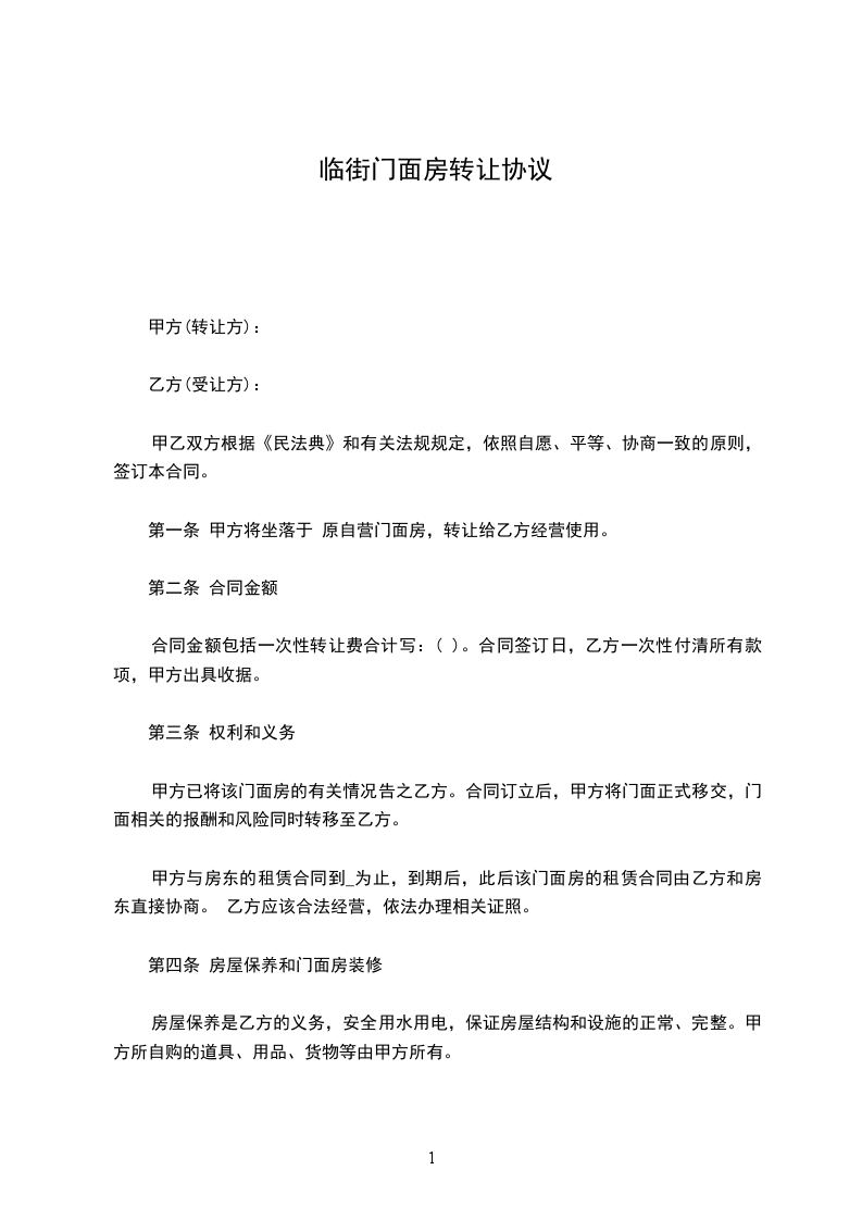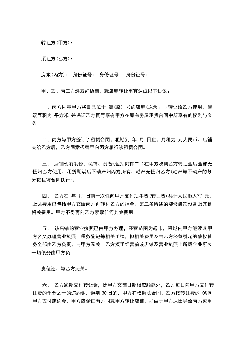 一、丙方同意甲方将自己位于____________街(路)____________号的门面转让给乙方使用,建筑面积为____________平方米;并保证乙方同等享有甲方在原有房屋租赁合同中所享有的权利与义务,在甲方转让租期满后,租期按照原租赁协议顺延年,并由乙方与丙方按原合同条款重新签订租赁合同。不重新签订租赁合同不影响租期自动顺延。