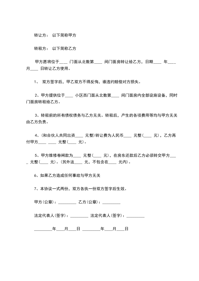 五、乙方于本合同签订之日向甲方支付定金_______元。甲方在合同签订次日向乙方腾让门面并交付钥匙,同时乙方向甲方支付转让费共计人民币_______元,(大写:__________),上述费用已包括第三条所述的装修、装饰、设备及其他相关费用,此外甲方不得再向乙方索取任何其他费用。