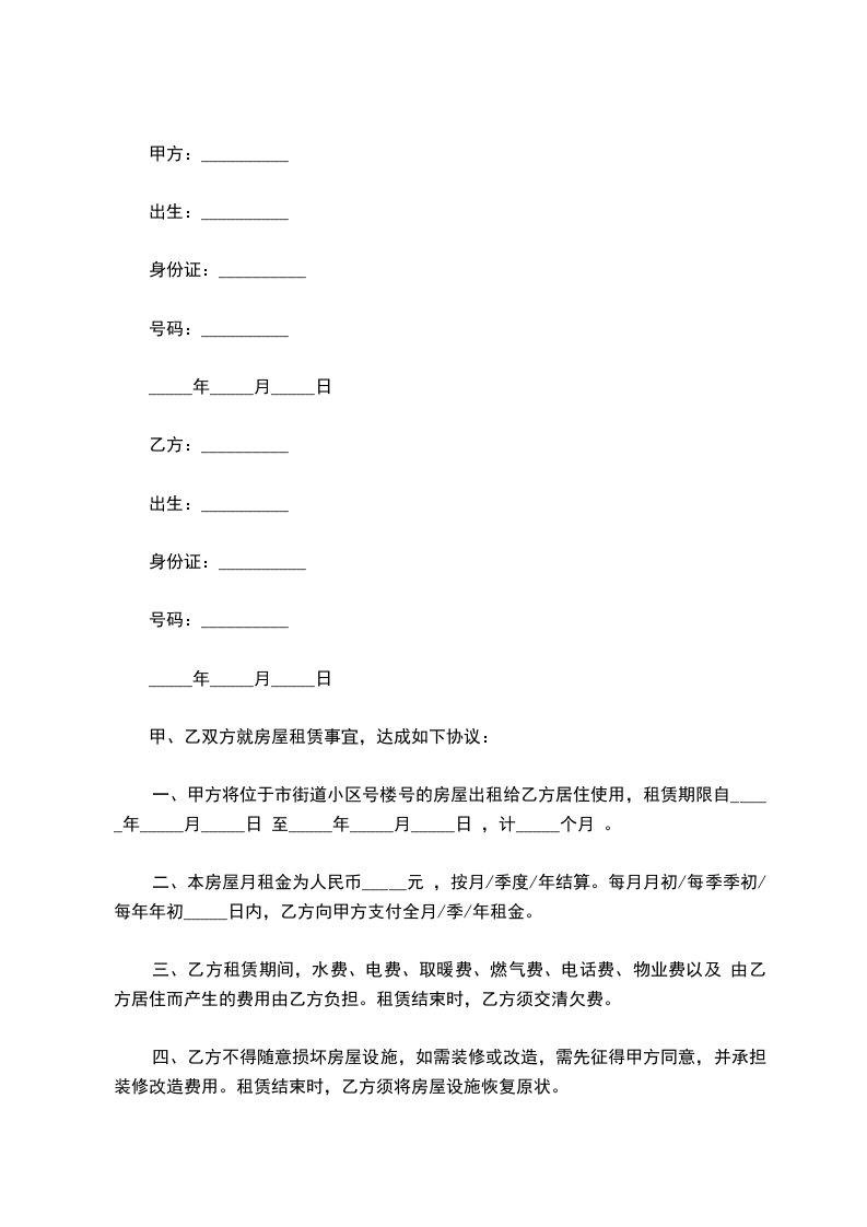 一、甲方将位于市街道小区号楼号的房屋出租给乙方居住使用,租赁期限自_____年_____月_____日 至_____年_____月_____日 ,计_____个月 。