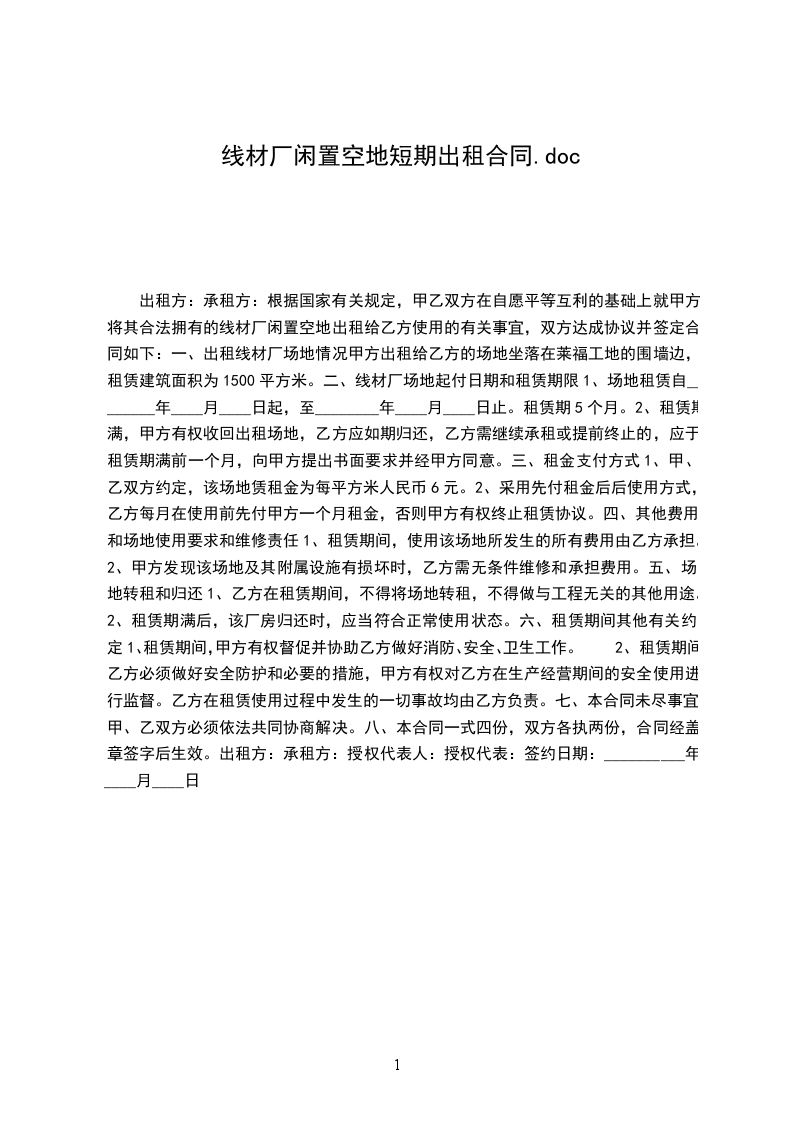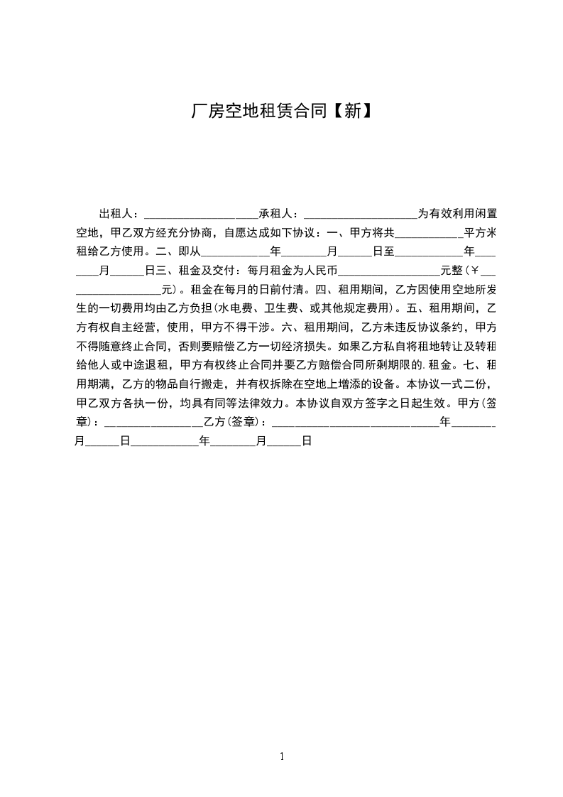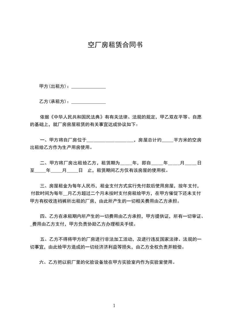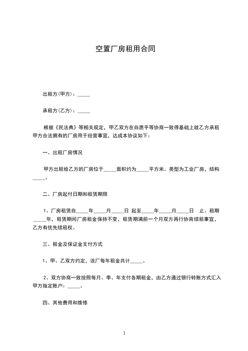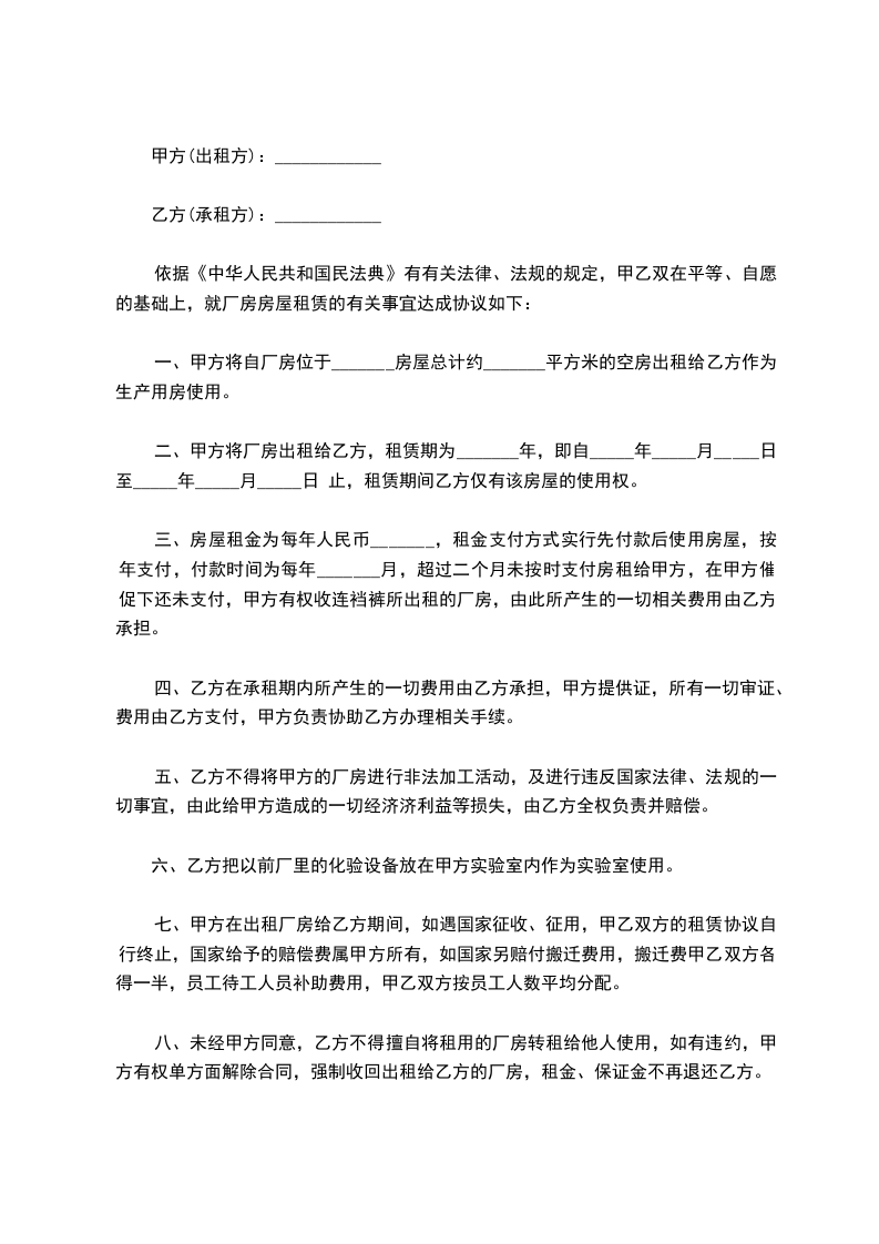 1、厂房租赁自_____年_____月_____日 起至_____年_____月_____日 止。租期_____年,租赁期间厂房租金保持不变,租赁期满前一个月双方再行协商续租事宜,乙方有优先续租权。