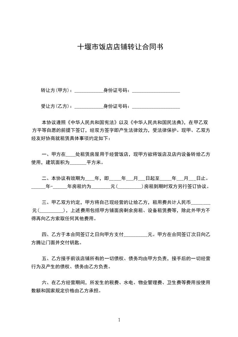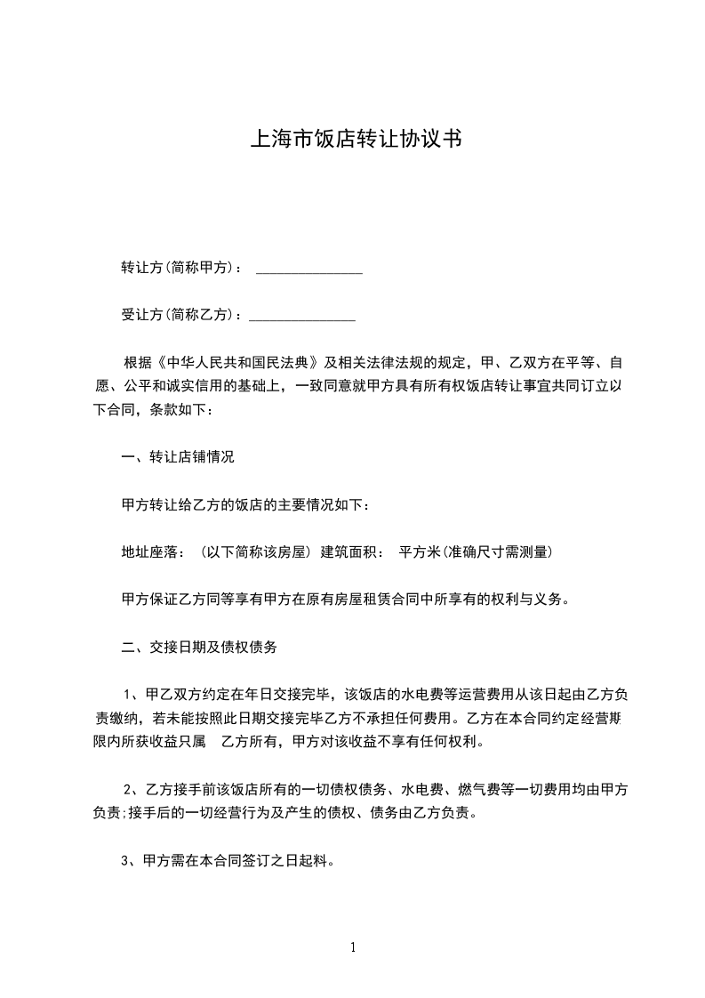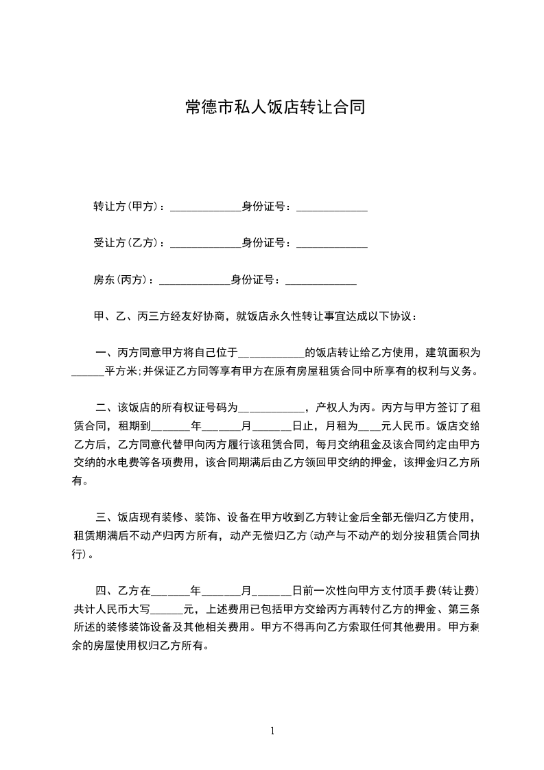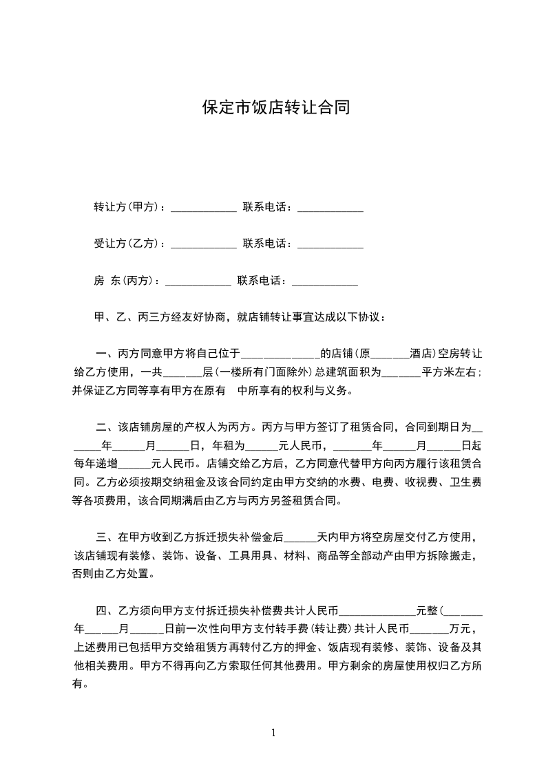 一、丙方同意甲方将自己位于______________的店铺(原_______酒店)空房转让给乙方使用,一共_______层(一楼所有门面除外)总建筑面积为_______平方米左右;并保证乙方同等享有甲方在原有 中所享有的权利与义务。