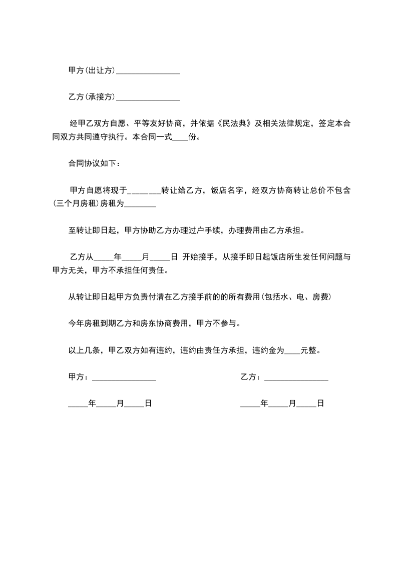 ______________体转让后,乙方应继续履行原_______与出租方签订的合同期内的全部合同或协议,如乙方确需提前终止或变更原饭店与出租方签订的合同期内全部合同或协议,可与出租方另行签订协议。