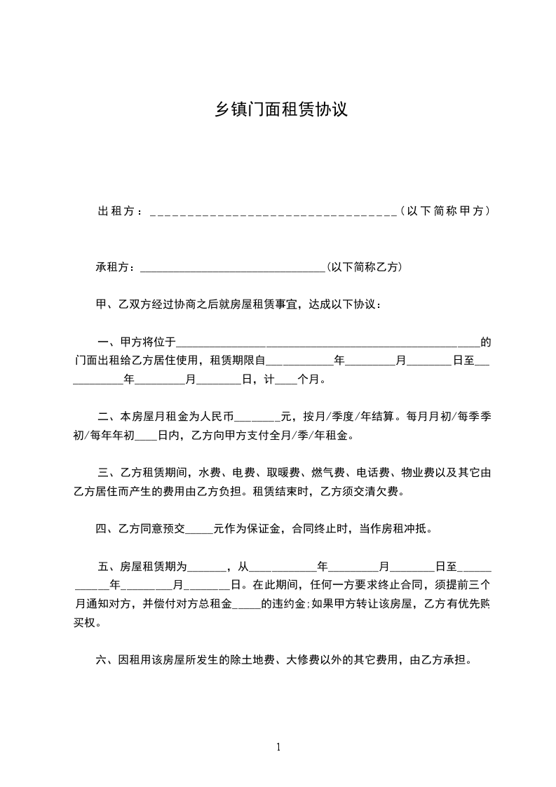 一、甲方将位于______________________________________________________的门面出租给乙方居住使用,租赁期限自____________年_________月________日至____________年_________月________日,计____个月。