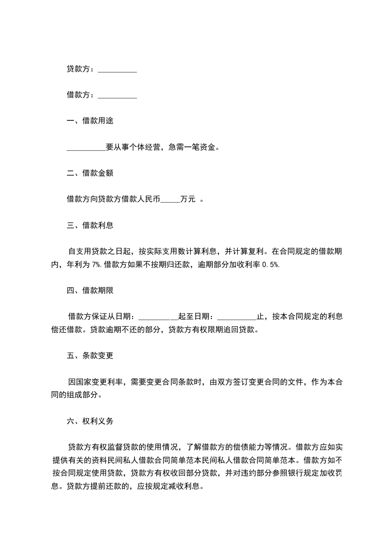 1、未经双方同意,任何一方当事人不得擅自变更或解除合同。如一方当事人要求变更或解除合同,应在__日内通知另一方当事人,并达成书面协议。本合同变更或解除后,借款方占用的借款和应付的利息仍应按本合同的规定偿付。