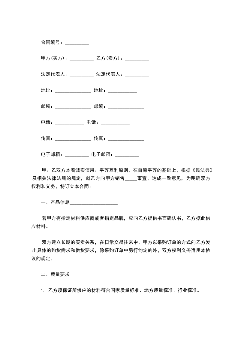 甲、乙双方本着诚实信用、平等互利原则,在自愿平等的基础上,根据《民法典》及相关法律法规的规定,就乙方向甲方销售_____事宜,达成一致意见,为明确双方权利和义务,特订立本合同: