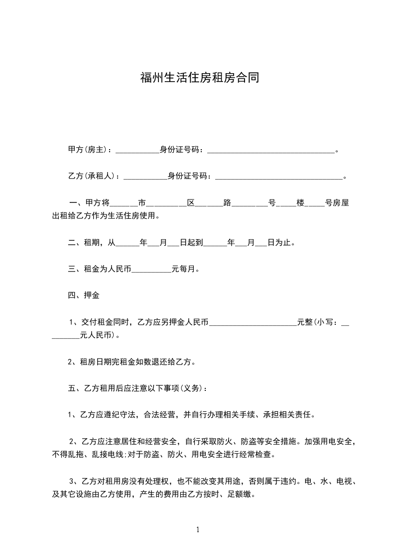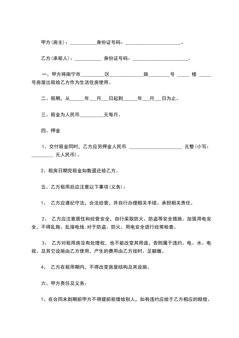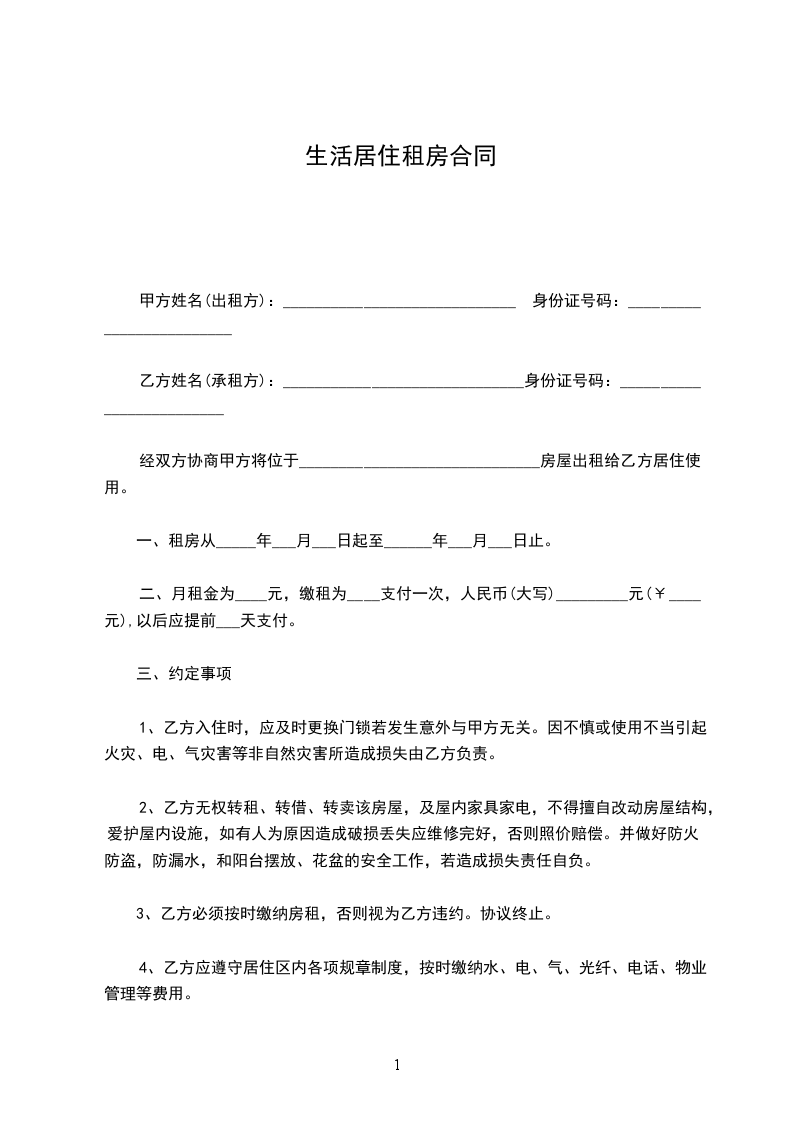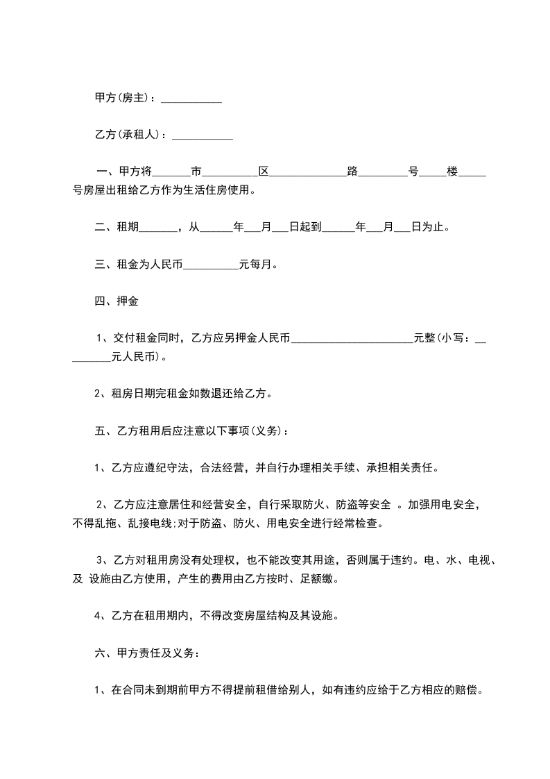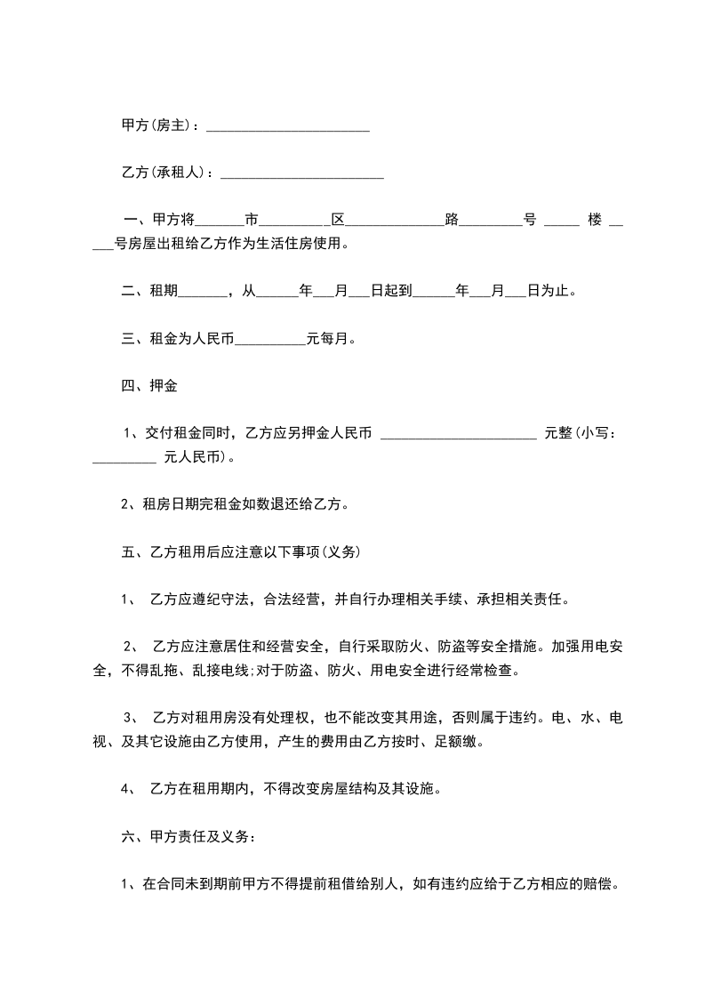 一、甲方将________市__________区______________路_________号_____楼_____号房屋出租给乙方作为生活住房使用。