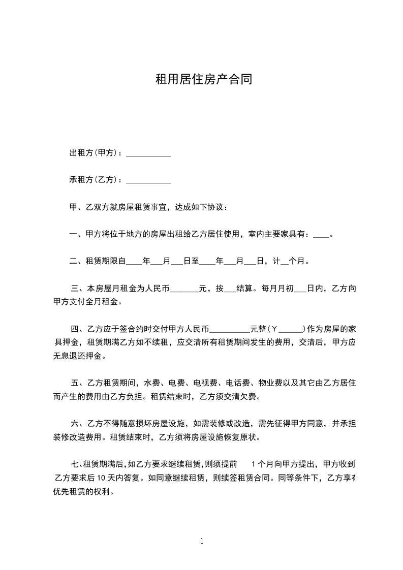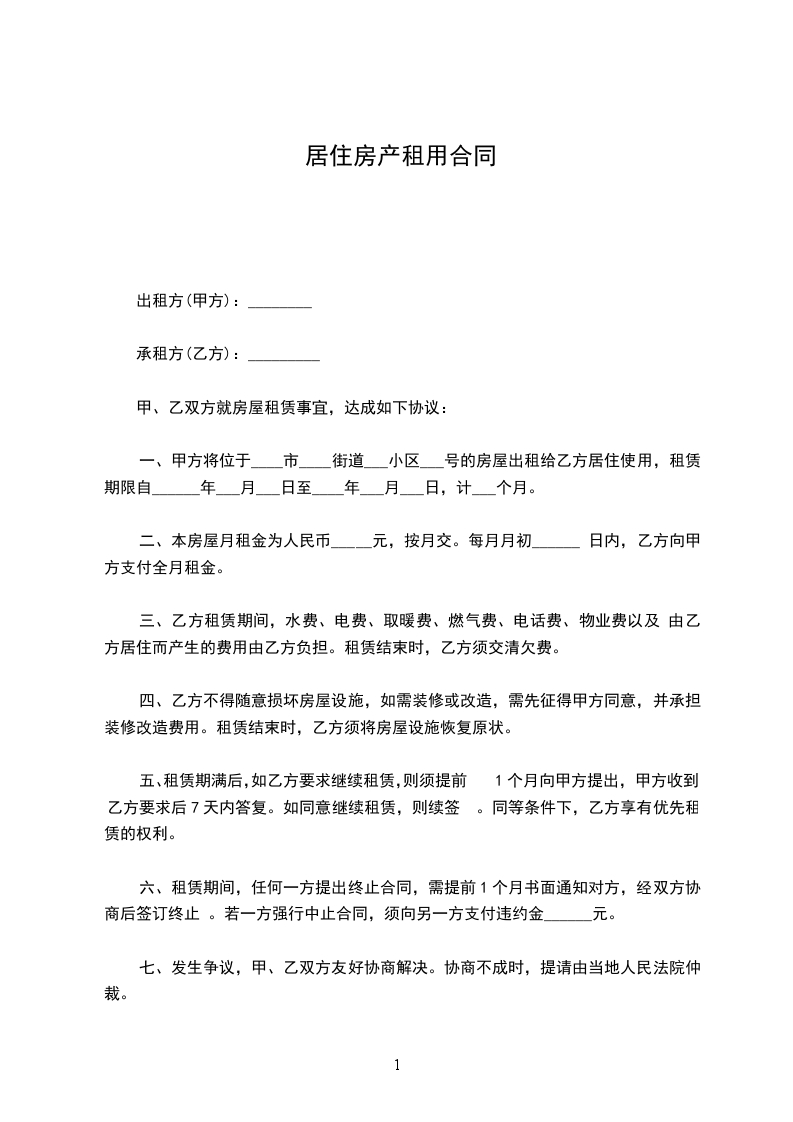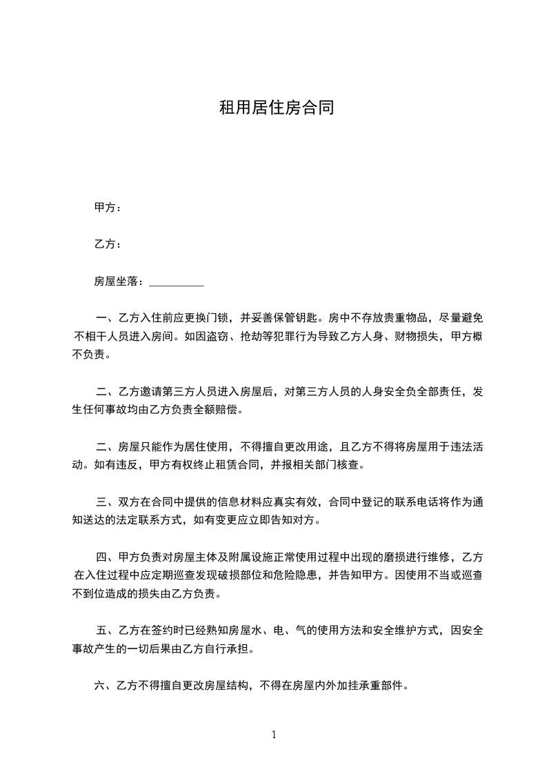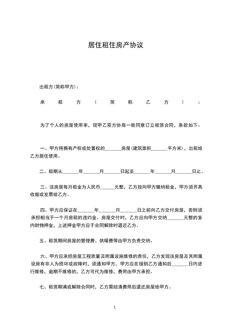 一、甲方将位于____市____街道___小区___号的房屋出租给乙方居住使用,租赁期限自______年___月___日至____年___月___日,计___个月。