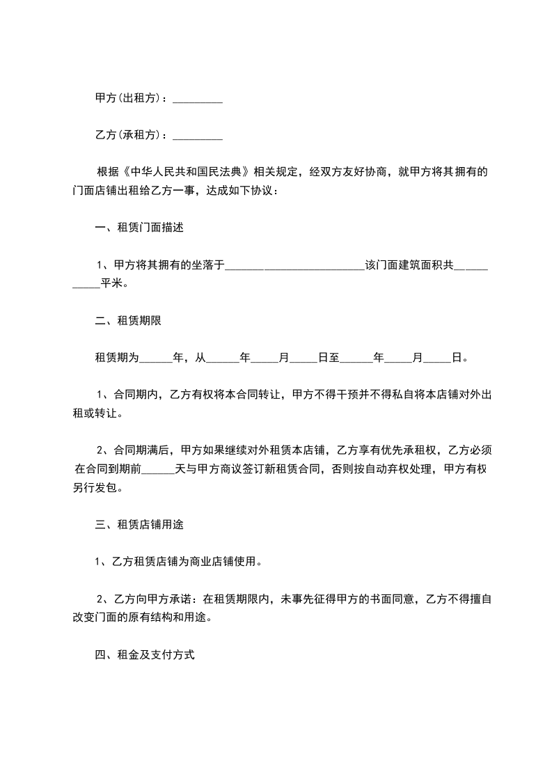 根据《中华人民共和国民法典》相关规定,经双方友好协商,就甲方将其拥有的门面店铺出租给乙方一事,达成如下协议: