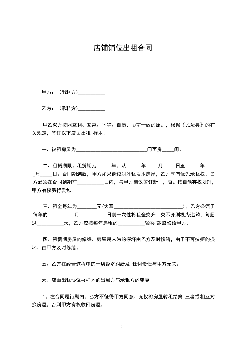 甲乙双方按照互利、互惠、平等、自愿、协商一致的原则,根据《民法典》的有关规定,签订以下店面出租 样本: