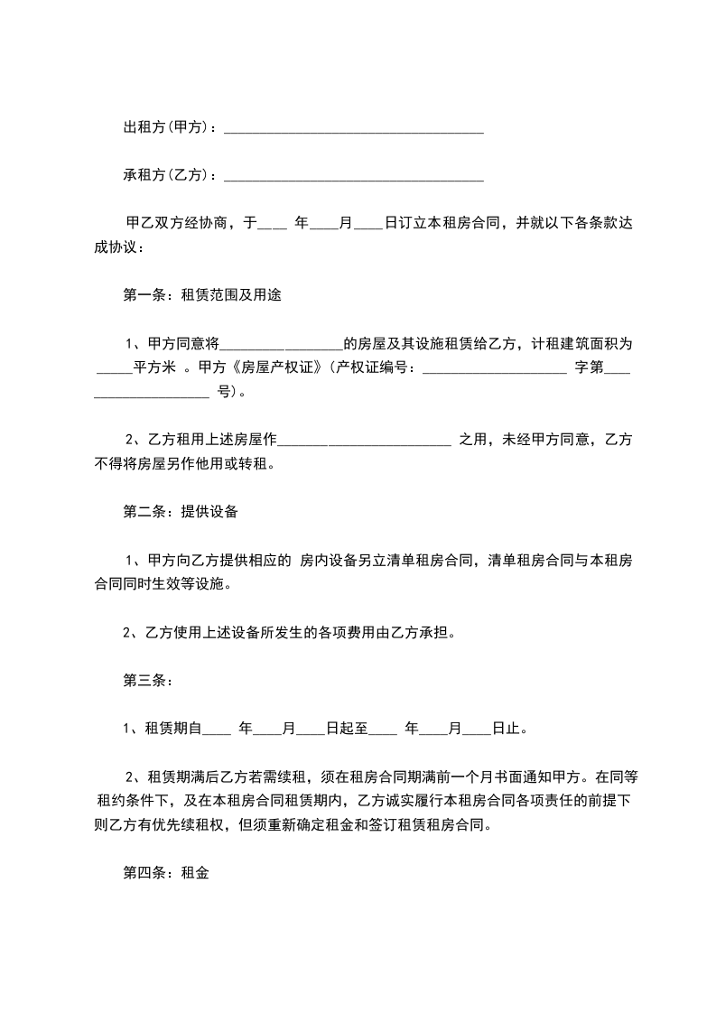 甲乙双方经协商,于____ 年____月____日订立本租房合同,并就以下各条款达成协议: