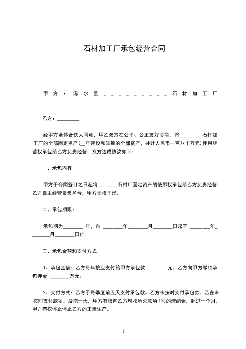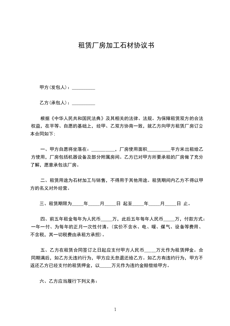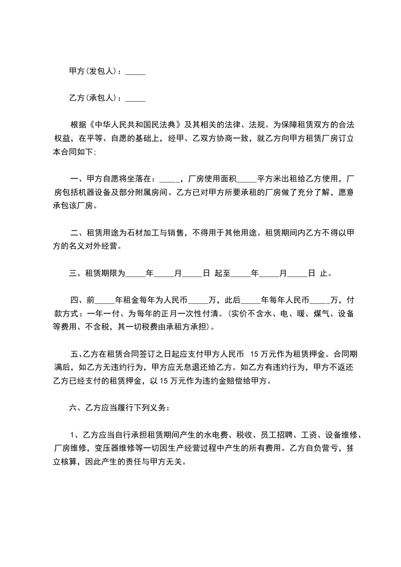 一、甲方自愿将坐落在:_____,厂房使用面积_____平方米出租给乙方使用,厂房包括机器设备及部分附属房间。乙方已对甲方所要承租的厂房做了充分了解,愿意承包该厂房。