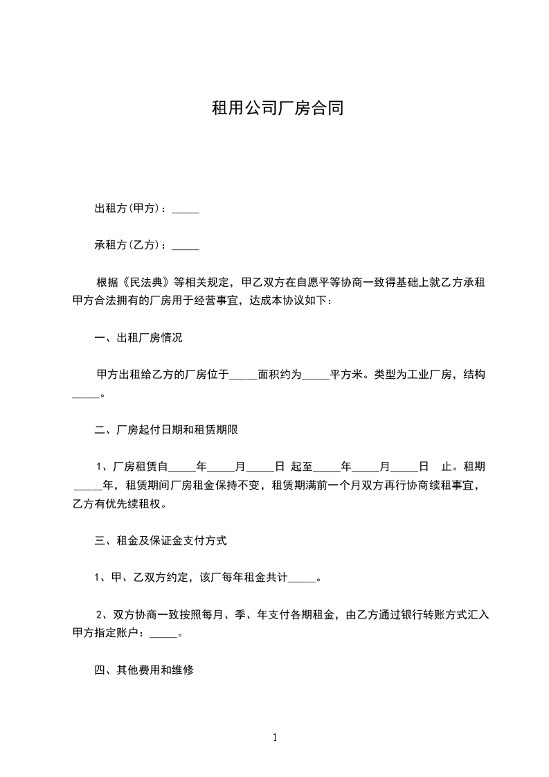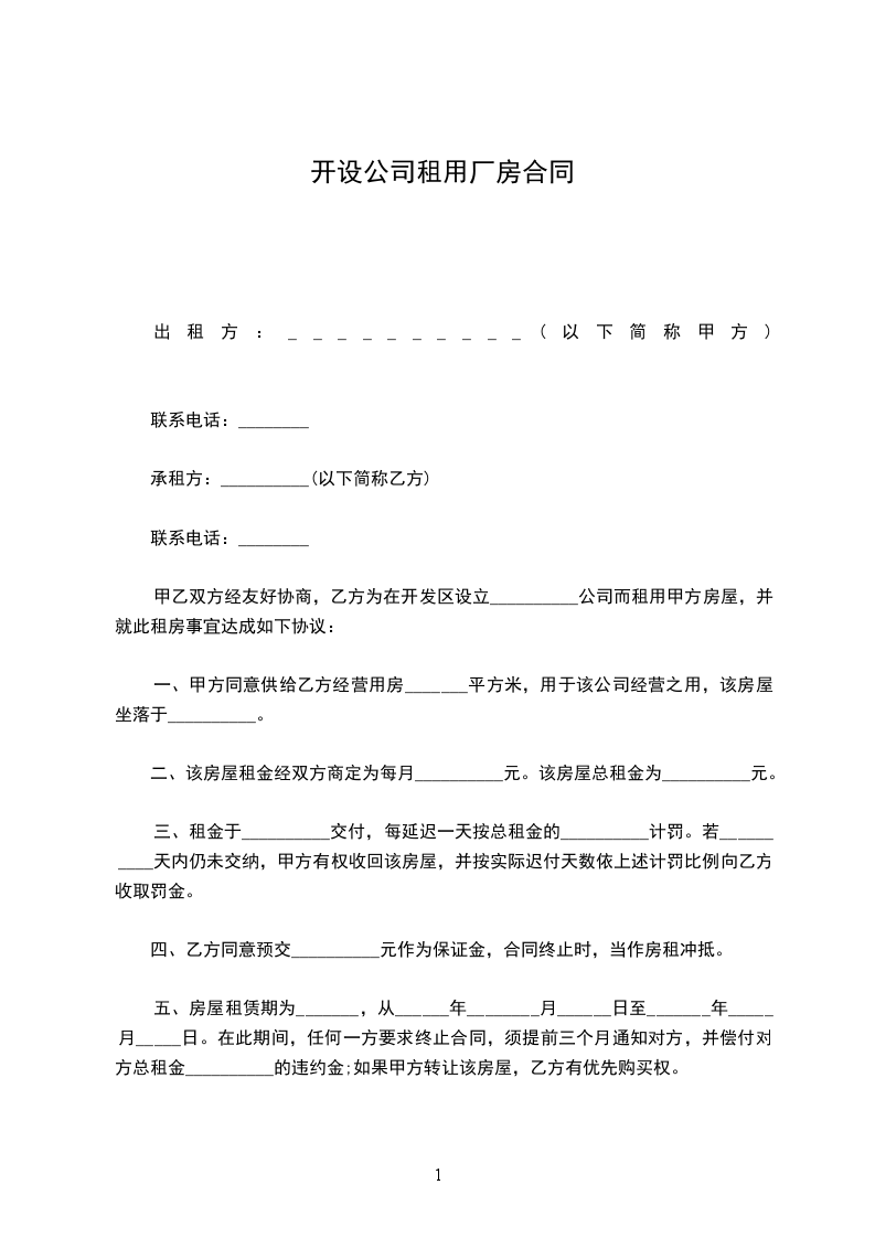 1、厂房租赁自_____年_____月_____日 起至_____年_____月_____日 止。租期_____年,租赁期间厂房租金保持不变,租赁期满前一个月双方再行协商续租事宜,乙方有优先续租权。