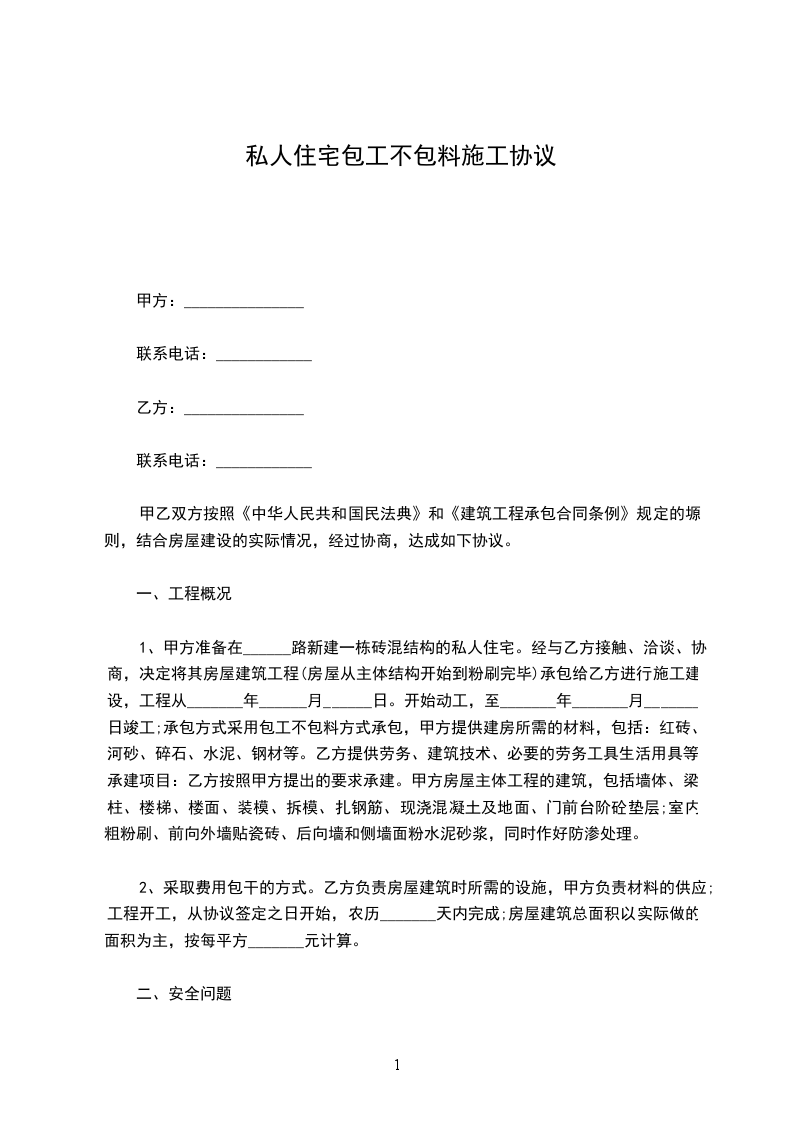 1、甲方准备在______路新建一栋砖混结构的私人住宅。经与乙方接触、洽谈、协商,决定将其房屋建筑工程(房屋从主体结构开始到粉刷完毕)承包给乙方进行施工建设,工程从_______年______月______日。开始动工,至_______年_______月_______日竣工;承包方式采用包工不包料方式承包,甲方提供建房所需的材料,包括:红砖、河砂、碎石、水泥、钢材等。乙方提供劳务、建筑技术、必要的劳务工具生活用具等;承建项目:乙方按照甲方提出的要求承建。甲方房屋主体工程的建筑,包括墙体、梁、柱、楼梯、楼面、装模、拆模、扎钢筋、现浇混凝土及地面、门前台阶砼垫层;室内粗粉刷、前向外墙贴瓷砖、后向墙和侧墙面粉水泥砂浆,同时作好防渗处理。