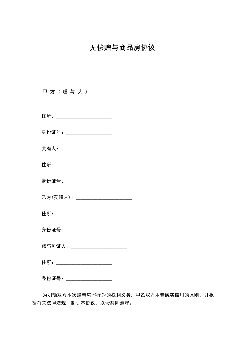 第一条 甲方决定将位于_________区_________街_________楼_________层_________号的房屋一套,房屋所有权证号:______ ,建筑面积_________平方米(商房、住宅)无偿赠与给乙方;乙方同意接受此赠与。甲方保证其对上述房屋拥有所有权。因甲方赠与房产系共有产权,此赠与行为由共有人确认并在此赠与合同上签字。