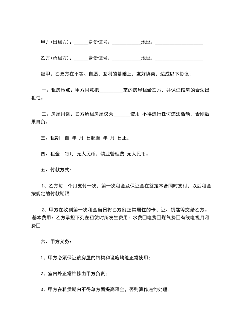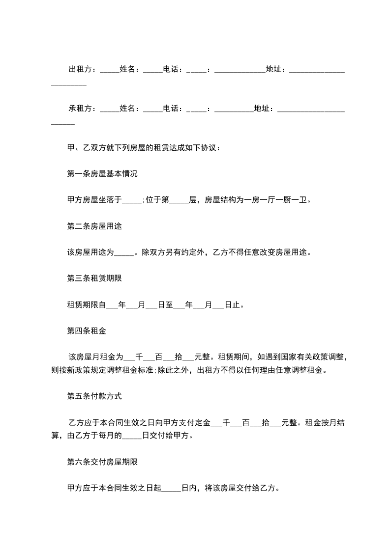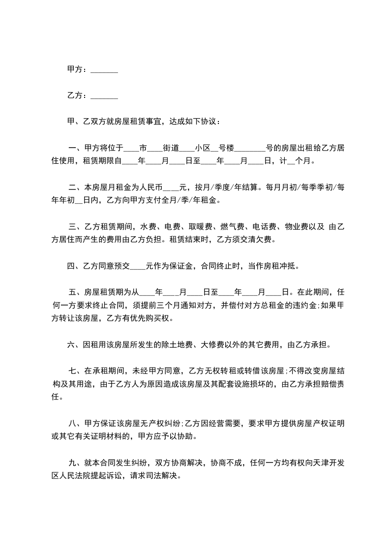 一、甲方将位于____市____街道____小区__号楼________号的房屋出租给乙方居住使用,租赁期限自____年____月____日至____年____月____日,计__个月。