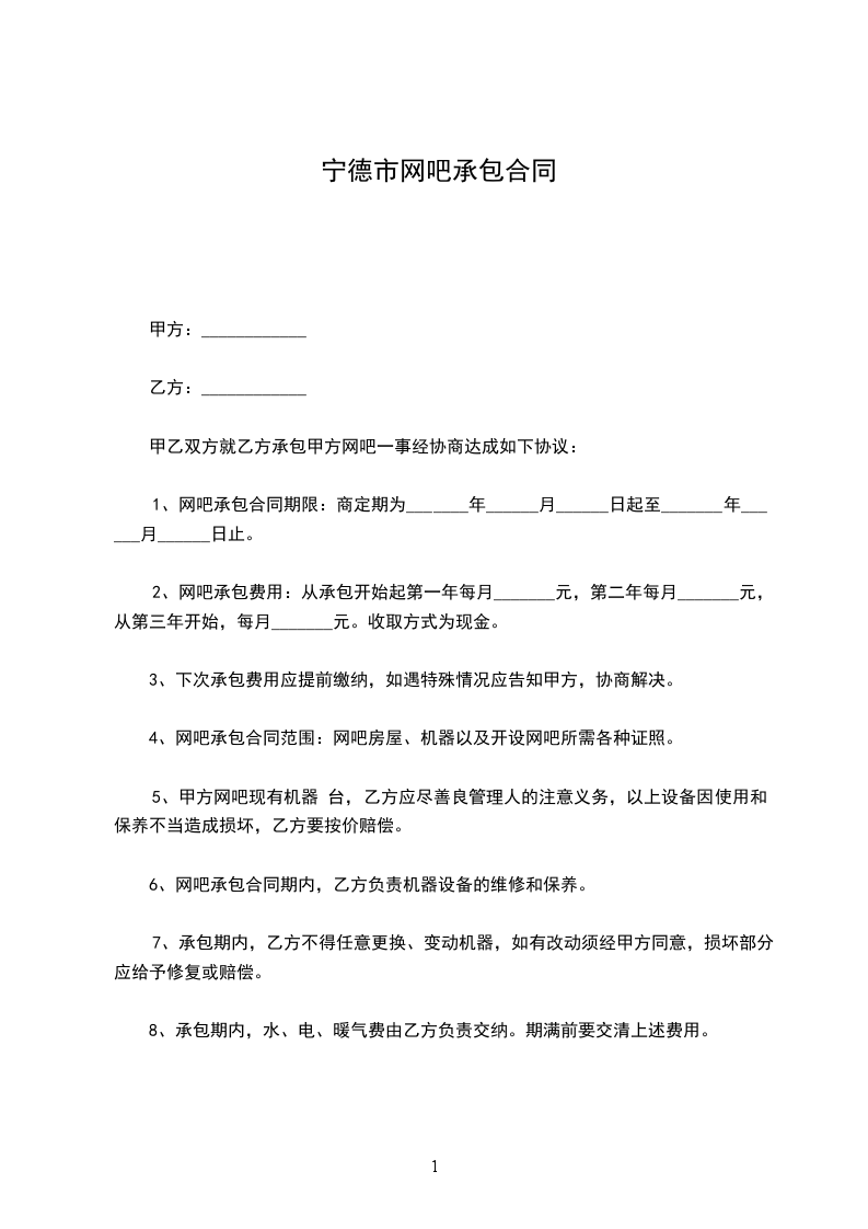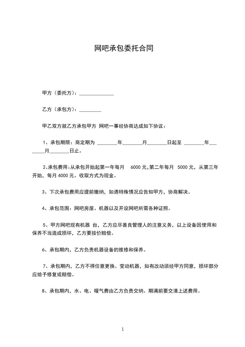 1、网吧承包合同期限:商定期为_______年______月______日起至_______年______月______日止。
