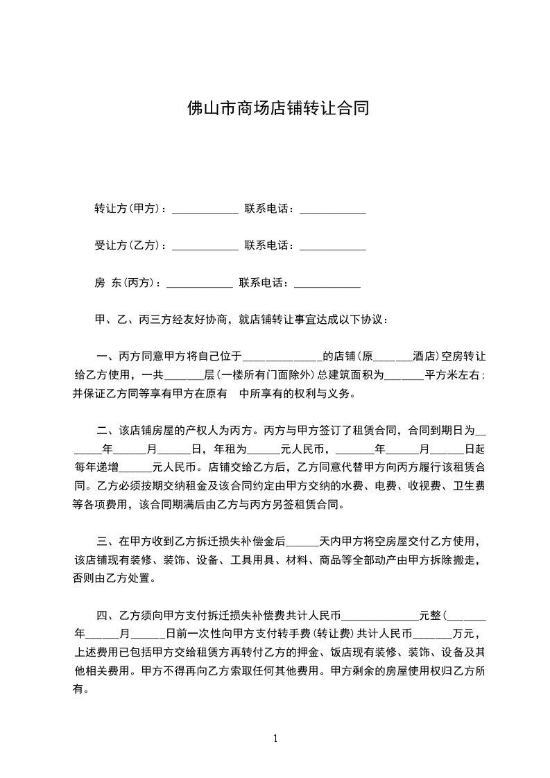 一、丙方同意甲方将自己位于______________的店铺(原_______酒店)空房转让给乙方使用,一共_______层(一楼所有门面除外)总建筑面积为_______平方米左右;并保证乙方同等享有甲方在原有 中所享有的权利与义务。